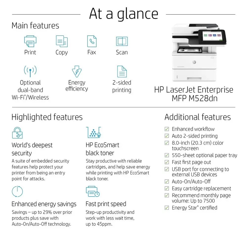 The HP LaserJet Enterprise M528dn is a monochrome multifunction printer engineered for medium to large office environments. It features a high-speed 1200 x 1200 dpi print resolution facilitated by an advanced laser printing engine optimized for crisp text and graphics. Powered by a 1.2 GHz dual-core processor and equipped with 512 MB RAM (expandable), it ensures efficient processing of complex print jobs. The M528dn supports fast printing speeds up to 45 pages per minute and includes automatic two-sided (duplex) printing capabilities to reduce paper usage. Connectivity options include Gigabit Ethernet and USB 2.0 ports, with support for PCL 6 and PostScript printing languages. Built-in security features such as Secure Boot and encrypted storage help protect sensitive documents in office workflows.