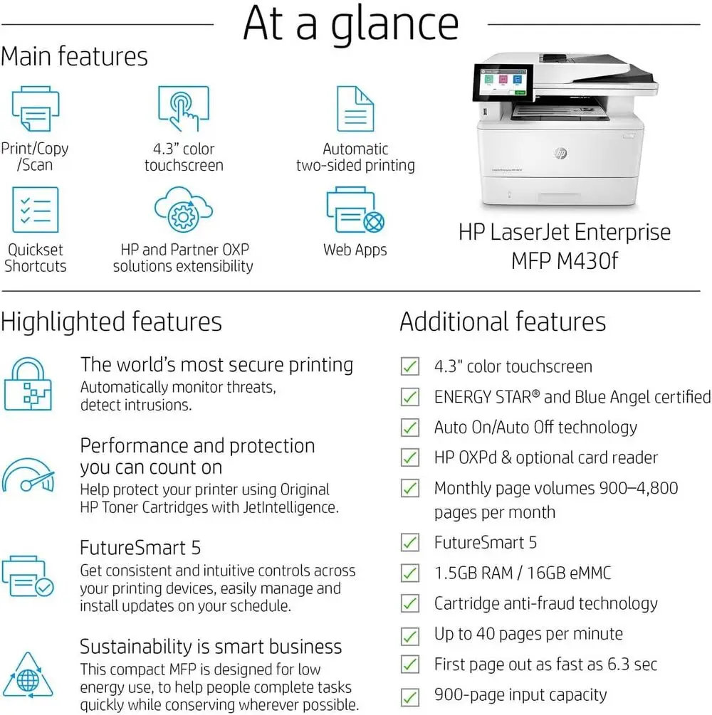 The HP M430f offers high-speed printing at up to 40 ppm, significantly reducing waiting times in busy offices. Its multifunction capabilities consolidate multiple devices, saving space and cost. Automatic duplexing lowers paper consumption and operational expenses. Multiple connectivity options enhance versatility and ease of integration into existing networks. HP JetIntelligence technology optimizes toner usage, extending cartridge life and minimizing replacement frequency. The device also supports advanced security protocols to protect sensitive information and ensure safe printing environments.