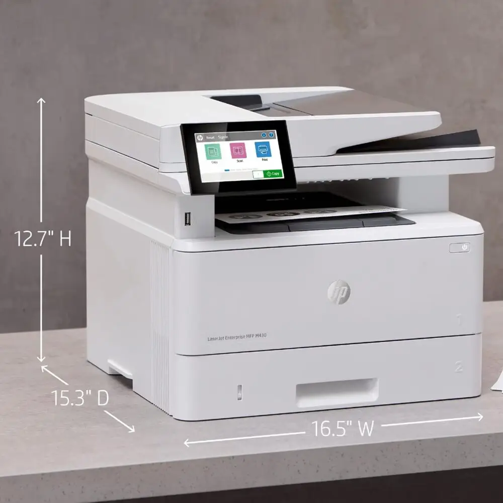 The HP M430f supports printing, scanning, copying, and faxing, making it a versatile multifunction device.