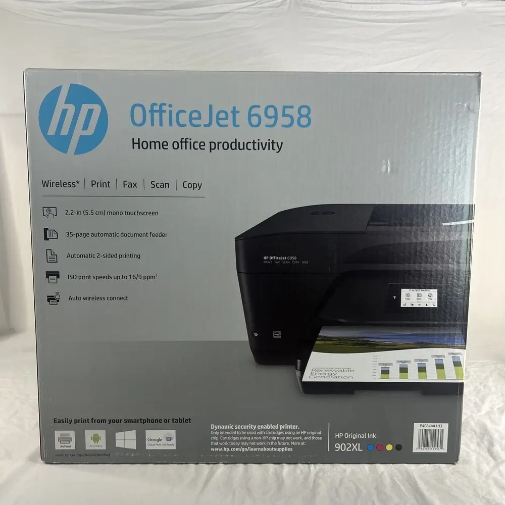 The HP Officejet 6958 offers multifunction versatility by integrating print, scan, copy, and fax in one device. Its wireless connectivity enables flexible placement without the need for wired network connections. With high print resolution and borderless color printing, it delivers professional-quality output suitable for business use. The ADF functionality improves productivity by automating multi-page document handling. Energy-efficient design and automatic duplex printing help reduce operational costs and paper waste. User-friendly touchscreen display allows easy navigation and management of printer functions.