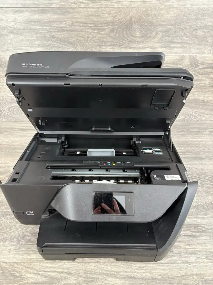The HP OfficeJet Pro 6958 offers robust multifunctionality in one compact unit, ideal for office environments. Its wireless and Ethernet networking options provide flexible connectivity for multiple users. The printer's touchscreen interface simplifies operation and connectivity setup. High-quality prints with sharp text and vivid colors are achievable thanks to HP's inkjet technology. Automatic duplex printing supports efficient paper usage and professional document finishing. Compatibility with mobile printing technologies allows users to print directly from smartphones and tablets.