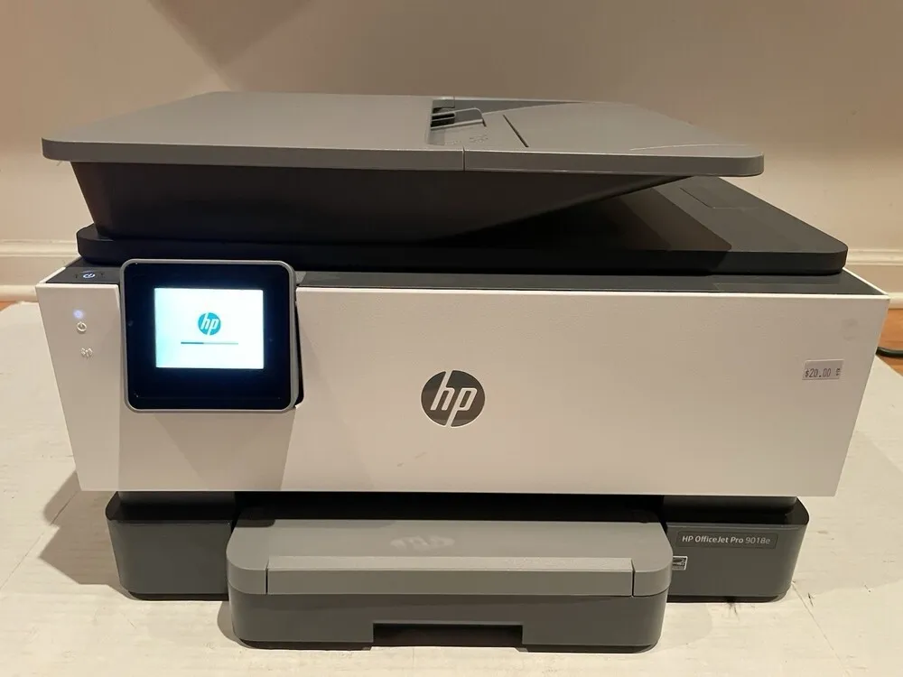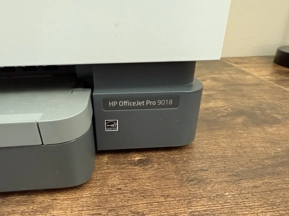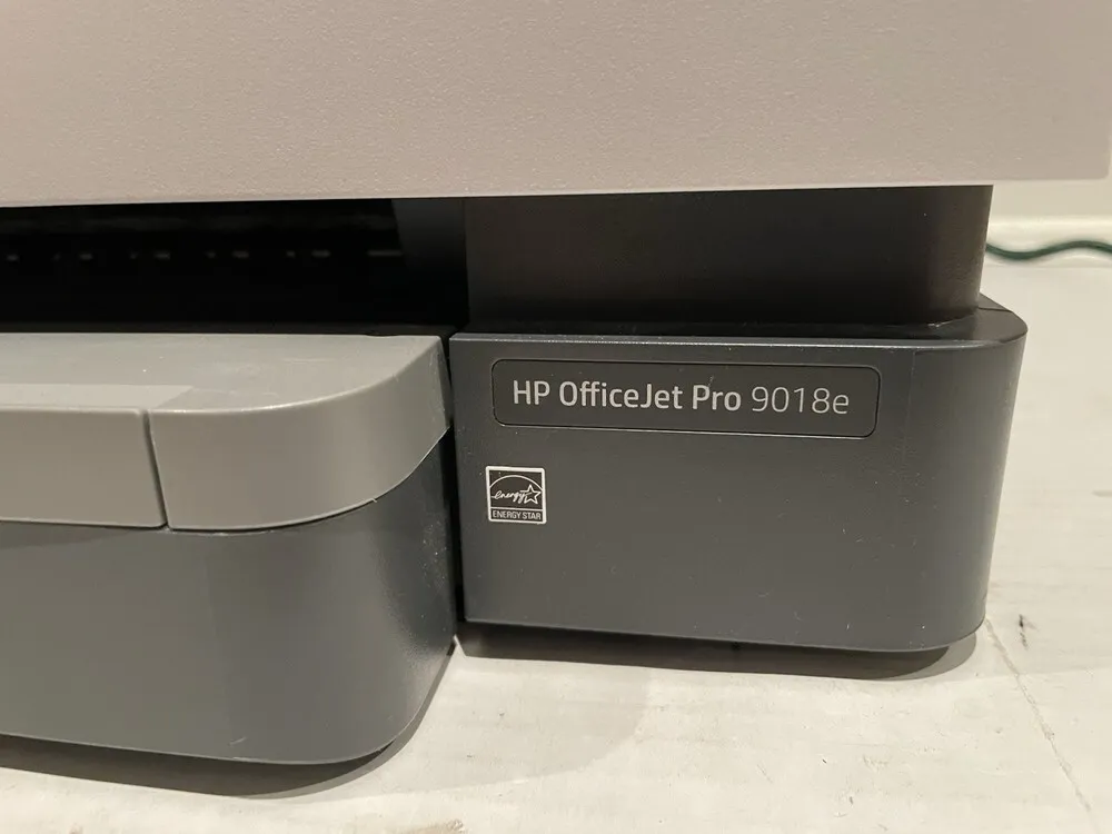 The HP Officejet Pro 9018e is an inkjet all-in-one printer designed for office environments, featuring printing, scanning, copying, and fax capabilities. It employs thermal inkjet technology with a maximum print resolution of up to 4800 x 1200 optimized dpi. The device supports a paper input capacity of up to 225 sheets and an automatic document feeder (ADF) with a capacity of 35 sheets, allowing efficient multi-page scanning and copying. Connectivity options include USB 2.0, Ethernet, and built-in Wi-Fi with support for HP's Smart App for mobile printing and management. The printer supports both color and monochrome print jobs, with a notable print speed of up to 22 pages per minute in black and 18 pages per minute in color. It is compatible with a wide range of operating systems including Windows and macOS.