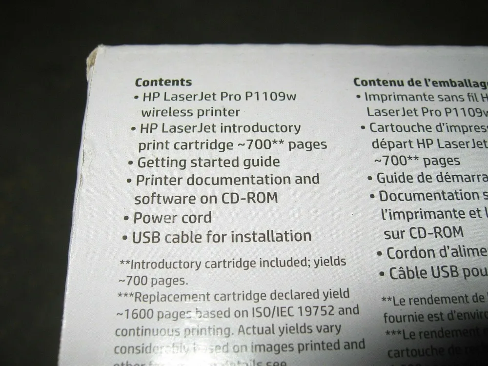 | Included Components | Getting Started guide, HP LaserJet Pro P1109w Printer, Installation guide, Power Cord, Printer documentation and software on CD-ROM, Support flyer, Warranty guide, introductory HP Black LaserJet Toner cartridge (~700 pages) |