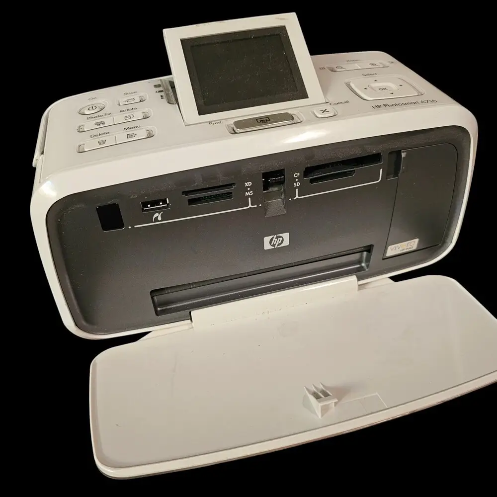 The Photosmart A716 supports only USB connectivity, lacking wireless or Ethernet options common in newer devices. Printing speed is modest compared to contemporary printers, making it less suitable for high-volume environments. The ink cartridge system, although effective, can be costly and requires frequent replacements when printing photos extensively. There is no automatic document feeder, which limits scanning and copying efficiency for multi-page documents. The maximum paper input tray capacity is small, requiring frequent refills during large print jobs. Additionally, it lacks support for modern mobile printing standards such as AirPrint or Google Cloud Print.