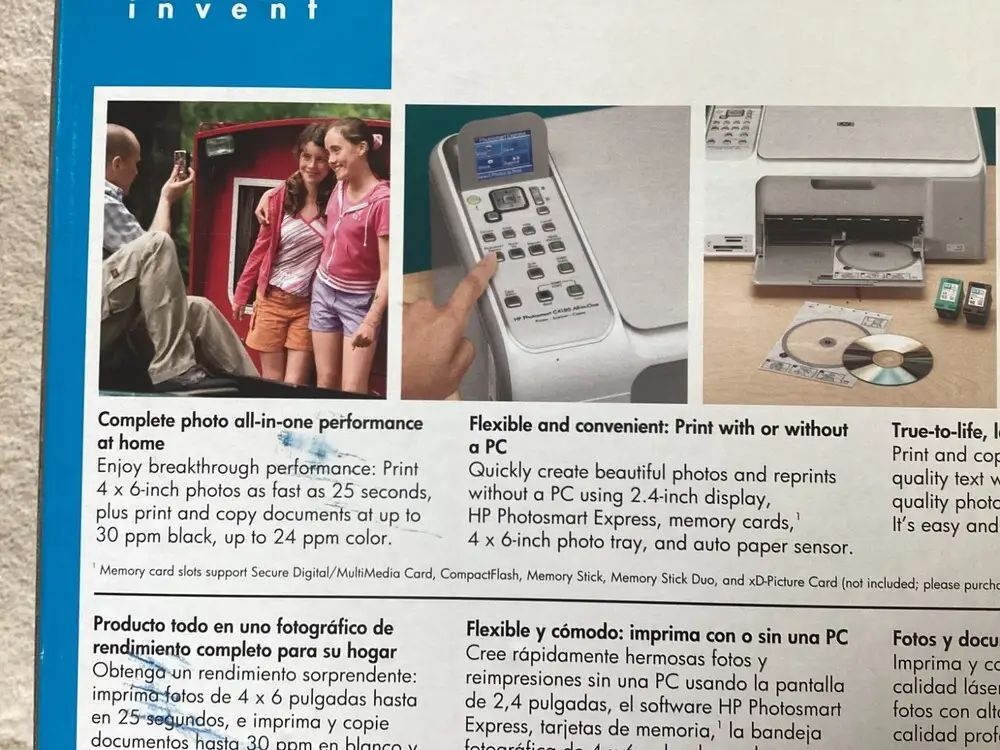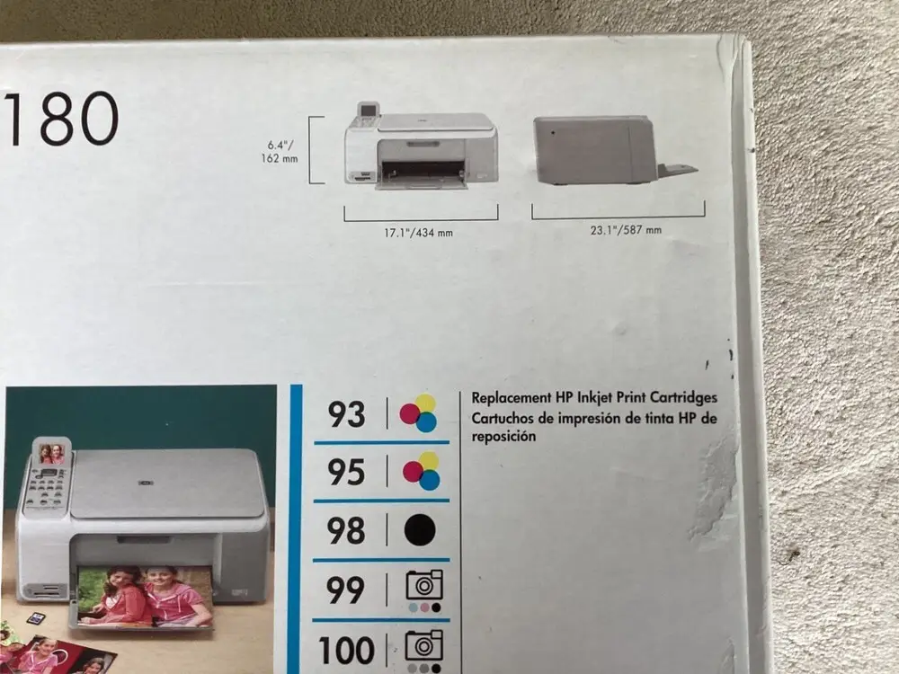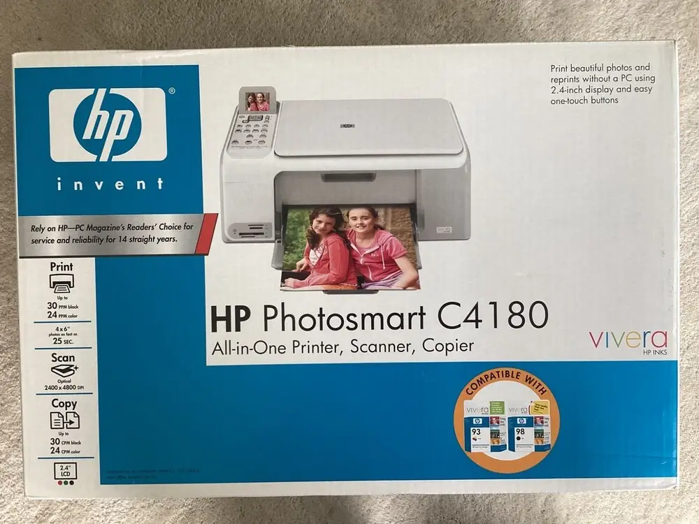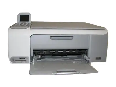 The device supports borderless photo printing and uses individual ink cartridges, which help to replace only the color that runs out. The flatbed scanner glass accommodates documents and photos up to A4/Letter size. The Photosmart C4180 employs HP's Easy Scan software for image editing and management. Print speeds are moderate, aligning with typical consumer-grade multifunction printers of its time. Energy-saving auto-off features reduce power consumption when idle. Overall, the device delivers versatile office functionality with moderate performance and connectivity options for its generation.