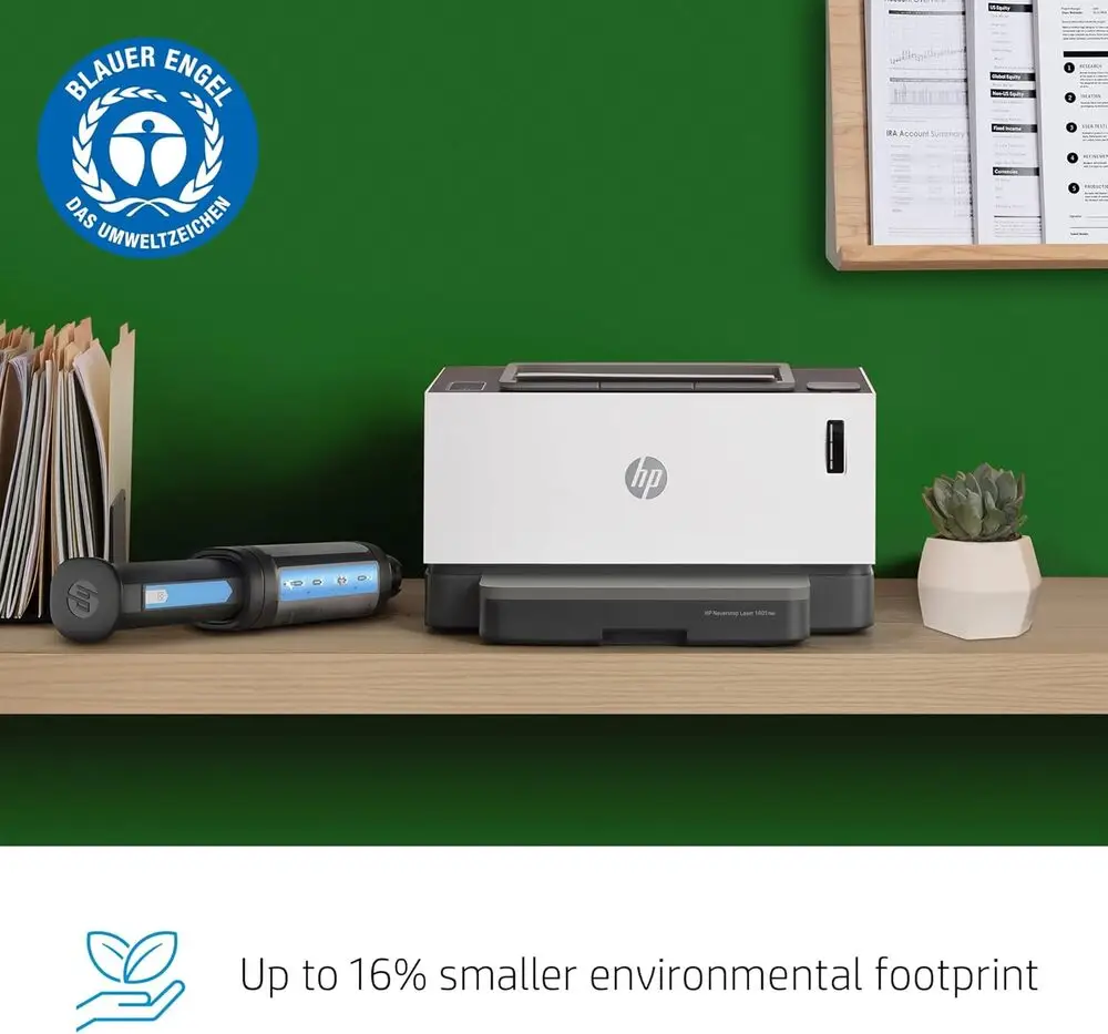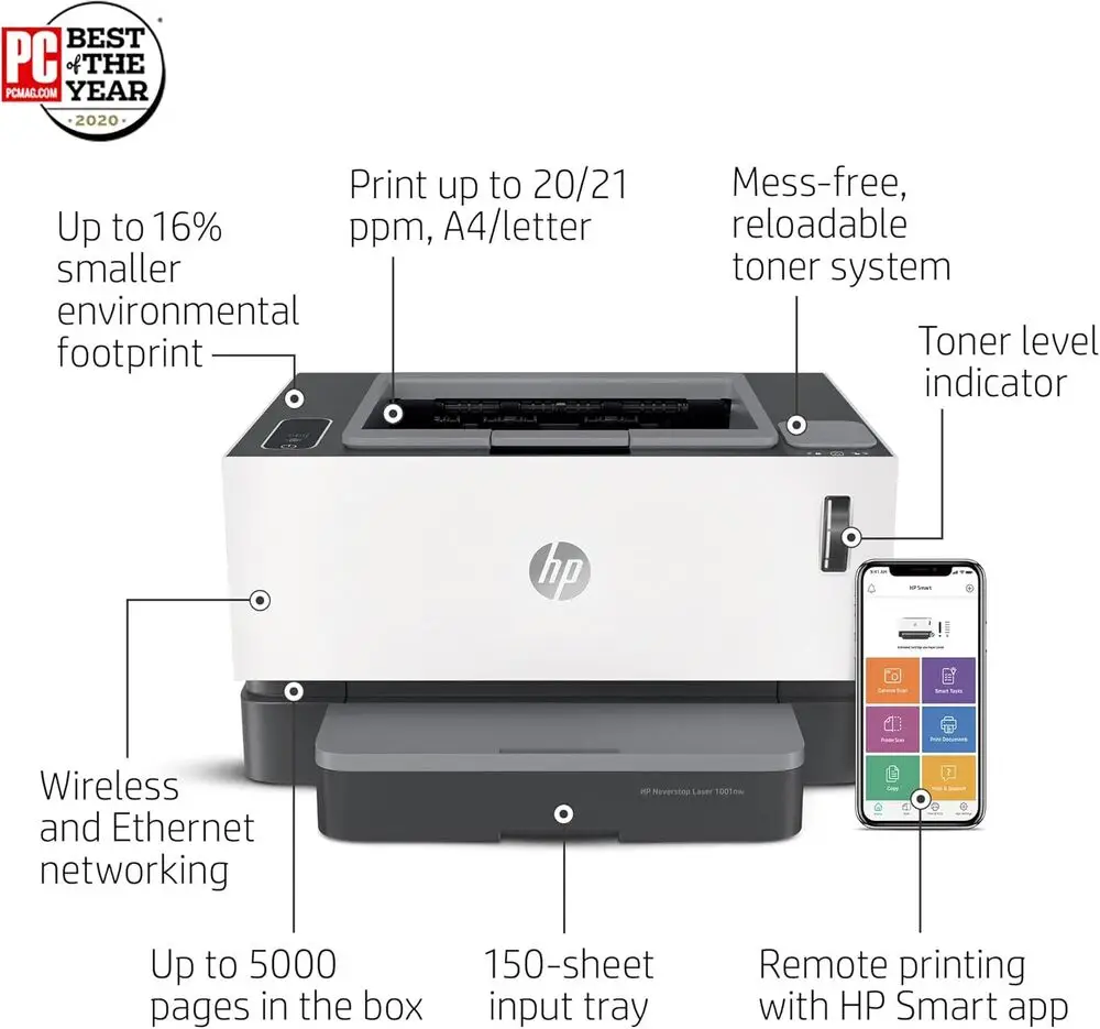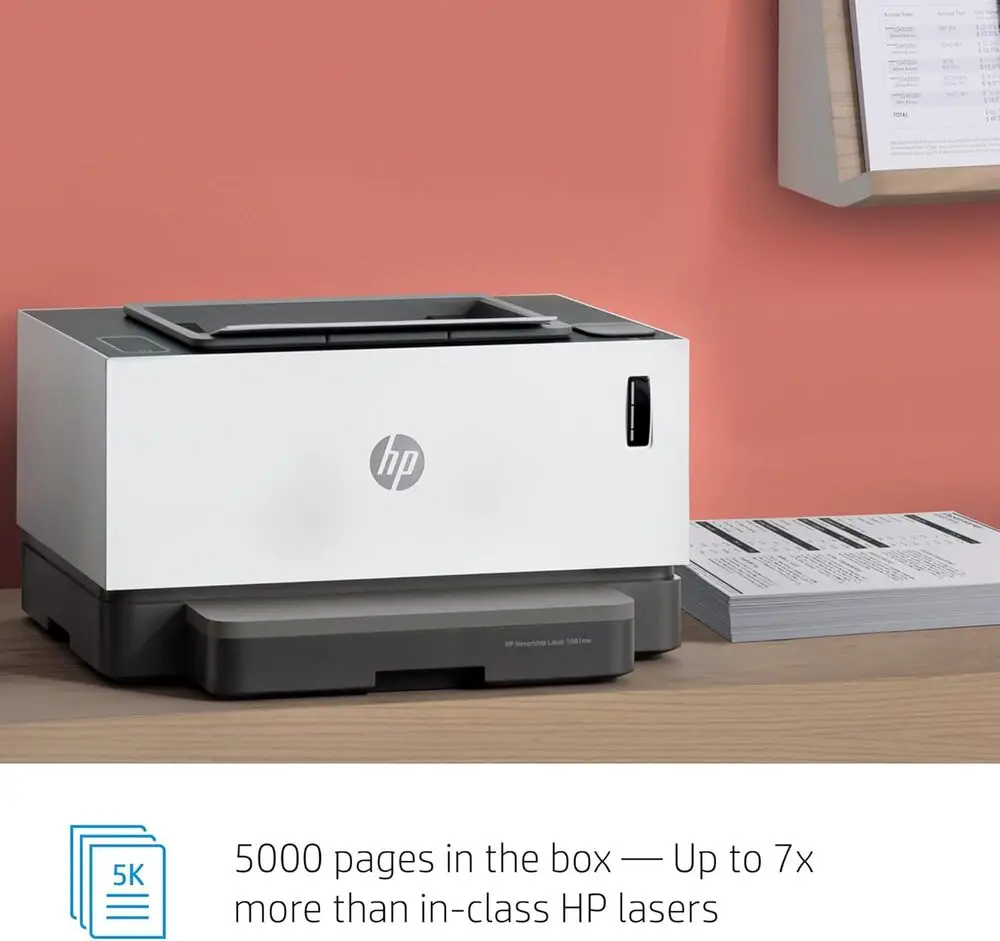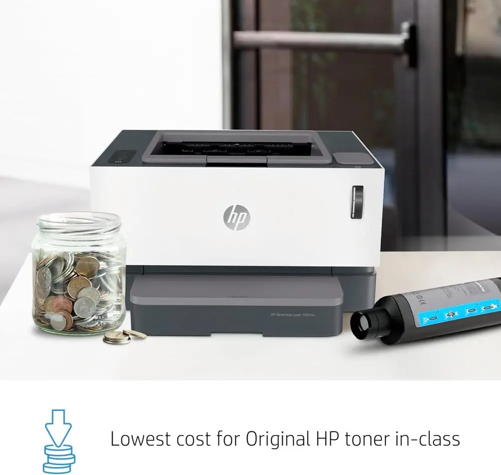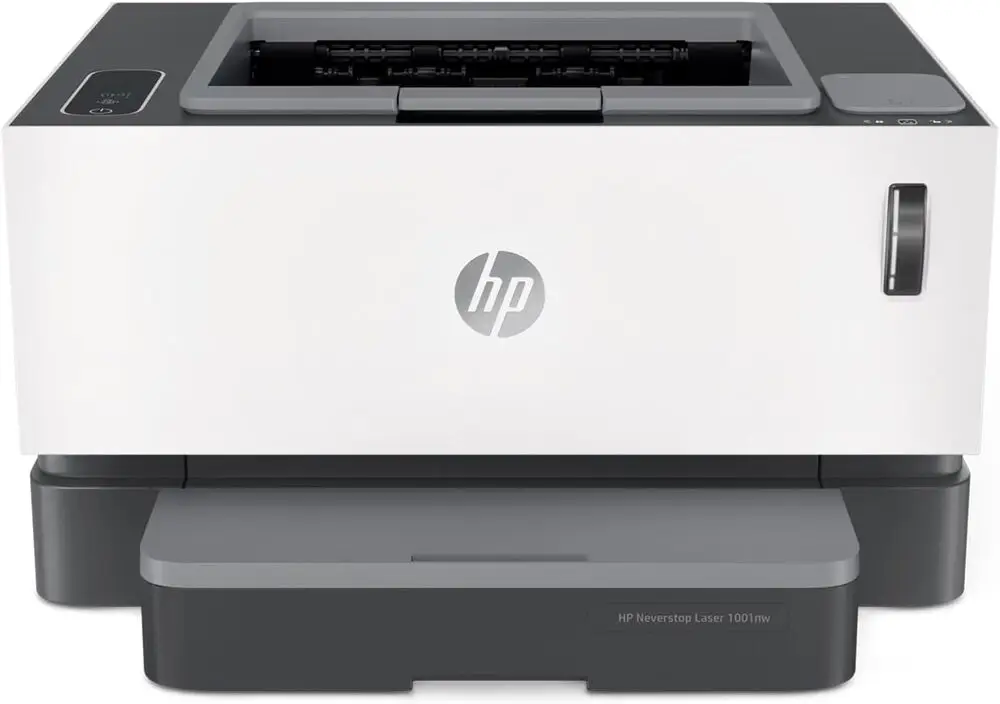 The HP Neverstop Laser printer uses monochrome laser printing technology with a toner reload system.