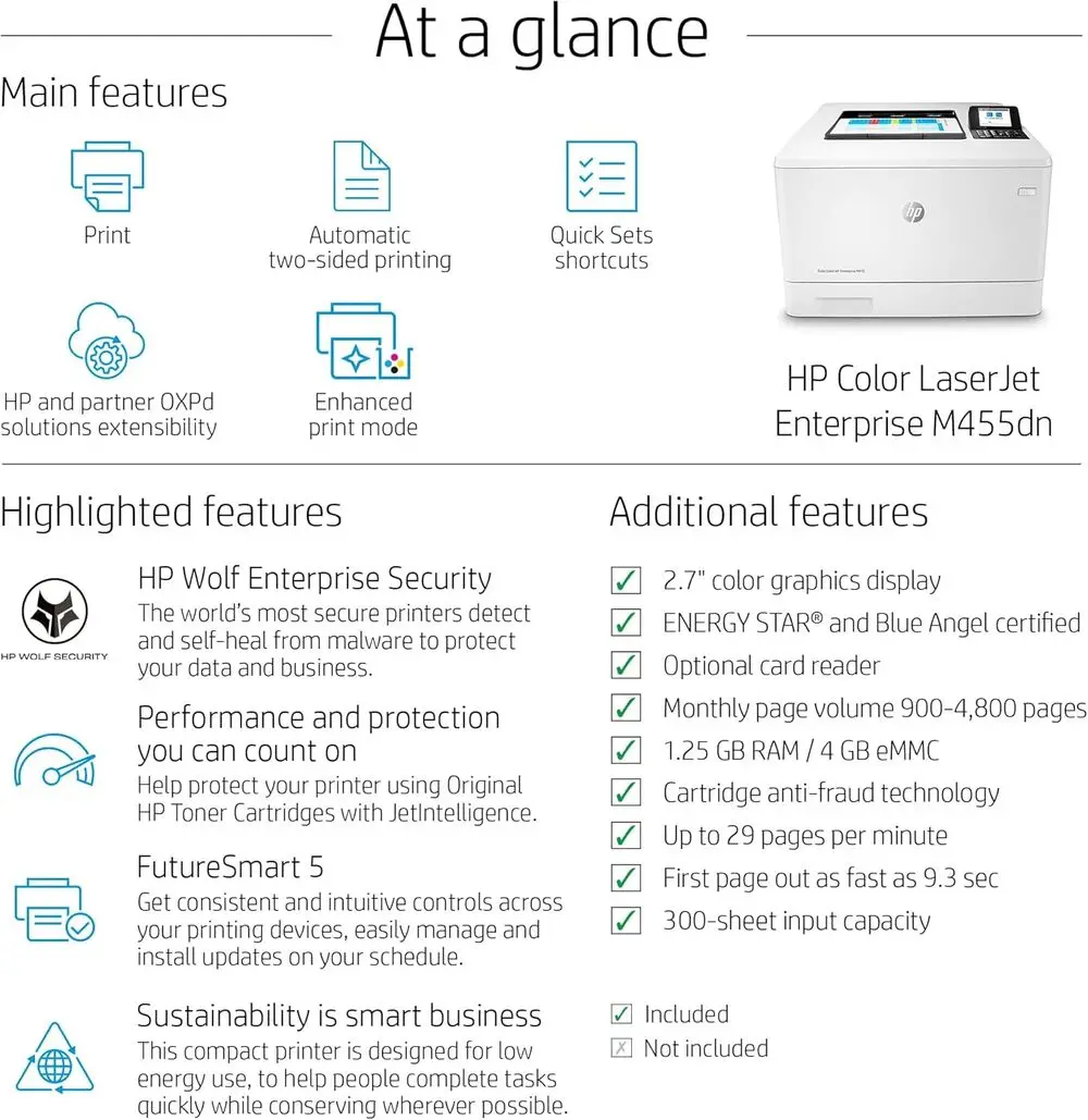 Included Components | HP Color LaserJet Enterprise M455dn printer; HP Black Original LaserJet Toner Cartridge (~2,400 pages); HP Cyan, Magenta, Yellow Original LaserJet Toner Cartridges (~2,100 pages each); Getting started Guide; 1 Power cord |