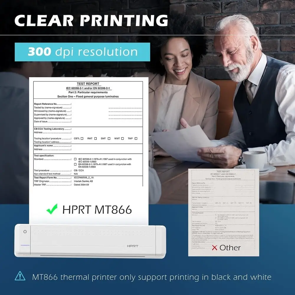 The HPRT MT-866 uses direct thermal printing technology, which prints by selectively heating thermal paper without requiring ink or toner.