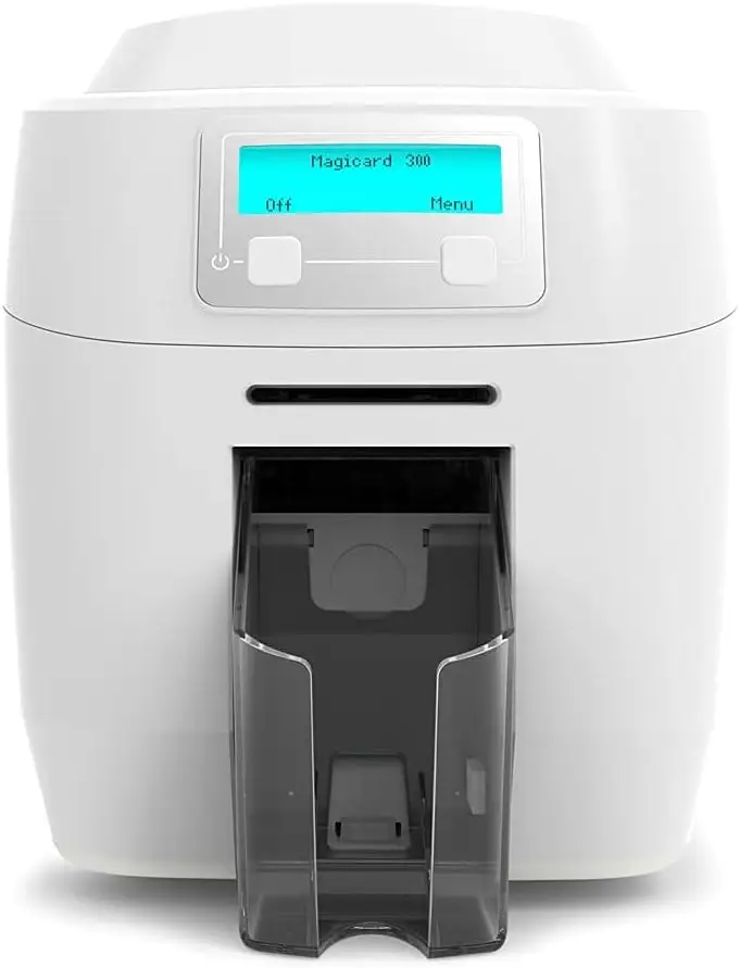 The Magicard 300 is a dedicated ID card printer designed for office environments requiring reliable card issuance. It employs dye-sublimation thermal transfer technology to produce high-quality, durable color and monochrome prints. The printer supports a printing resolution of 300 dpi, ensuring clear and sharp image output. It is equipped with a built-in magnetic stripe encoder for encoding data on magnetic stripe cards. The system supports various card sizes and thicknesses, offering flexibility for different ID applications. Connectivity is typically via USB, enabling easy integration with computers for card issuance workflows.
