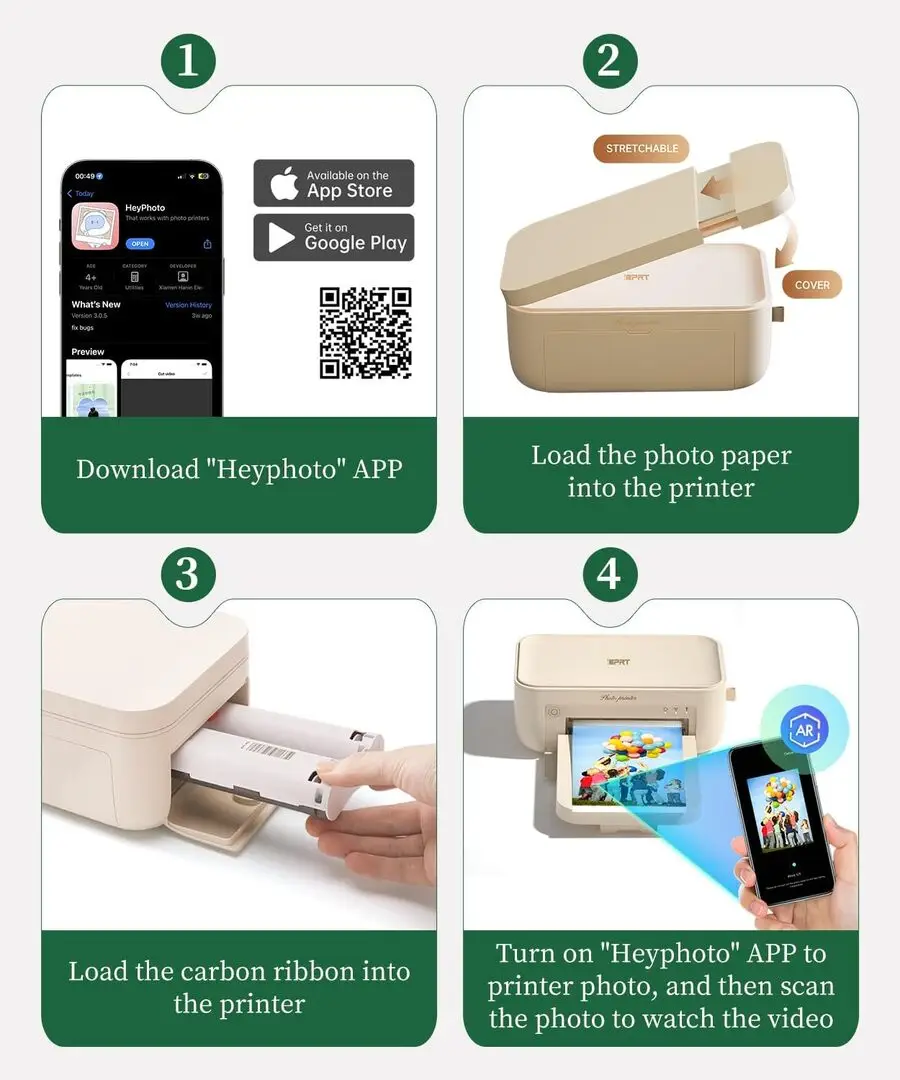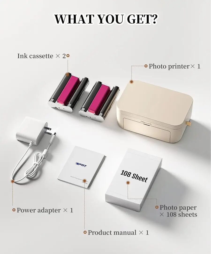 Included Components | Photo Paper × 108, Photo Printer × 1, Power Adapter × 1, Quick Start Guide × 1, Ribbon Cassette × 2 |