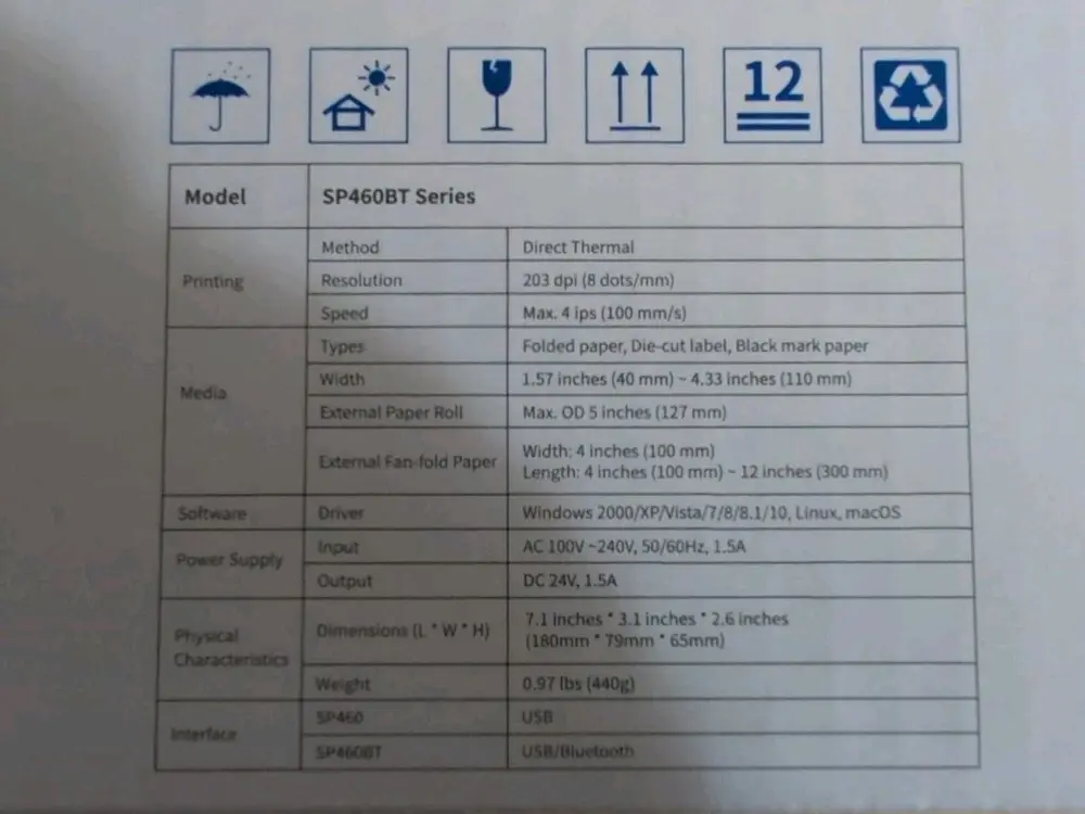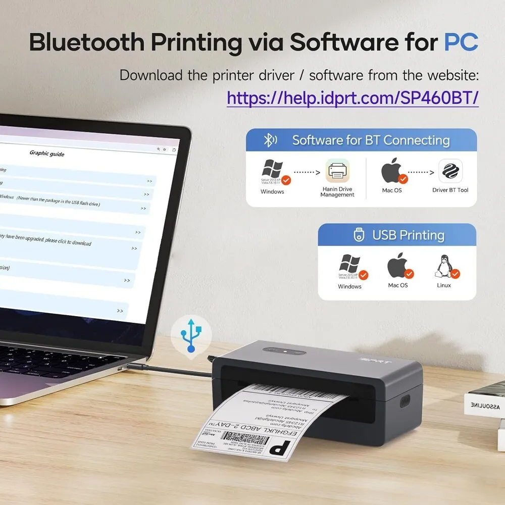 Included Components | 50 sheets thermal labels( 4'' X 6" ), SP460BT Bluetooth thermal label printer, USB C adaptor ( Only for Mac ), USB drive (Contains MAC OS driver and Windows printing software, please contact us if missing) |