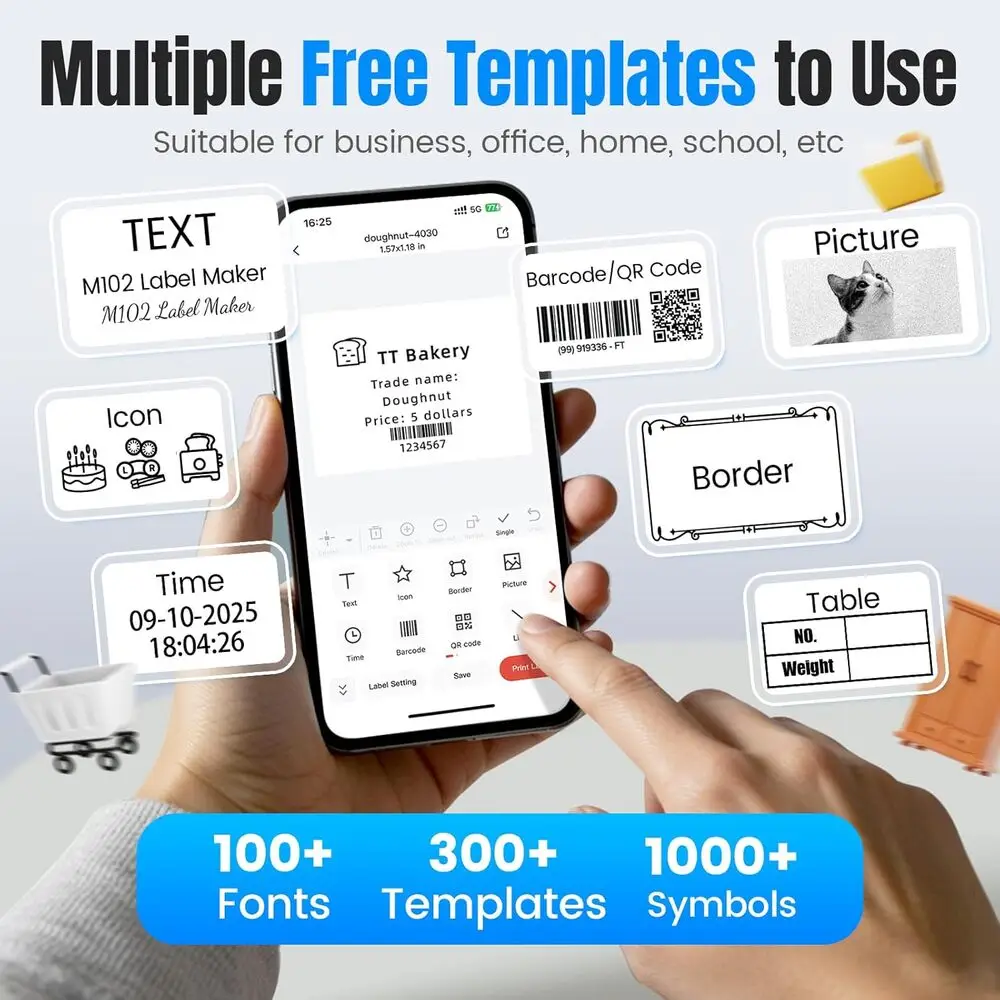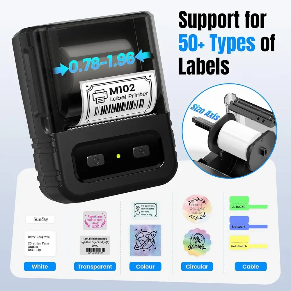 Included Components | 1 x 40x30 Thermal Labels Roll, 1 x Instruction Print media Labels, 1 x M102 Bluetooth Label Maker, 1 x USB Type-C Cable |