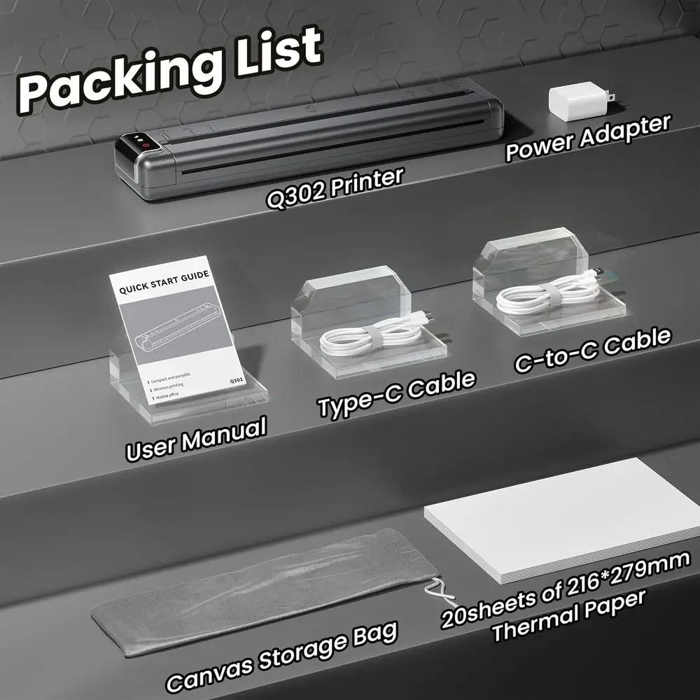 Included Components | 1 x Charger Plug, 1 x Q302 Portable Printer-Grey, 1 x USB Cable & Type C Convertor, 1 x Use Manual, 20 x US Letter Thermal Papers |