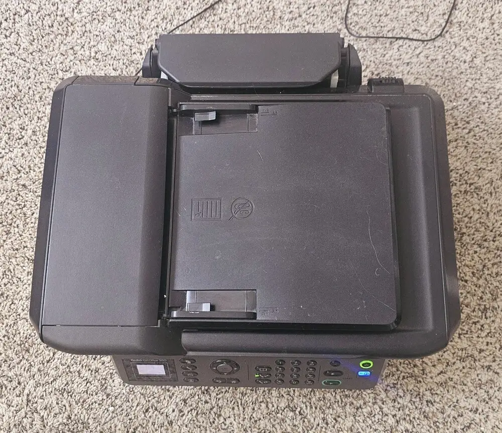 The device integrates printing, scanning, copying, and faxing functionalities with an automatic document feeder for scanning and faxing.