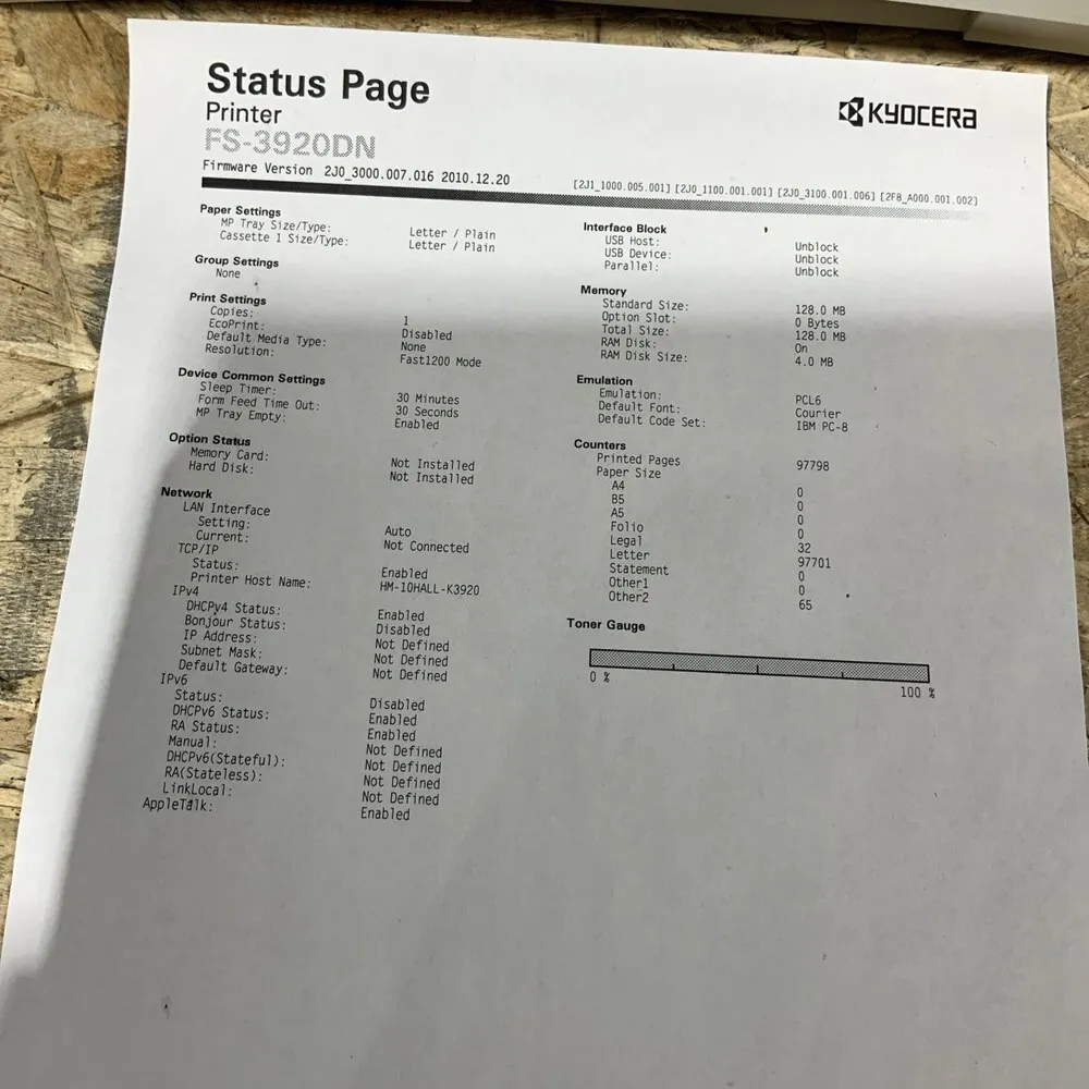 The KYOCERA FS-3920DN is a monochrome laser printer designed for high-volume office environments. It features a fast print speed of up to 40 pages per minute and a standard input capacity of 600 sheets, extendable up to 2,600 sheets with optional trays. The printer supports a resolution of 1200 x 1200 dpi, ensuring sharp, professional-quality text outputs. Connectivity options include USB 2.0 and Ethernet 10/100Base-TX for seamless network integration. It supports PCL6 and KPDL (Kyocera's PostScript emulation) printing languages, enabling versatile compatibility. Energy-saving features are built in, complying with ENERGY STAR guidelines to reduce power consumption during low activity periods.