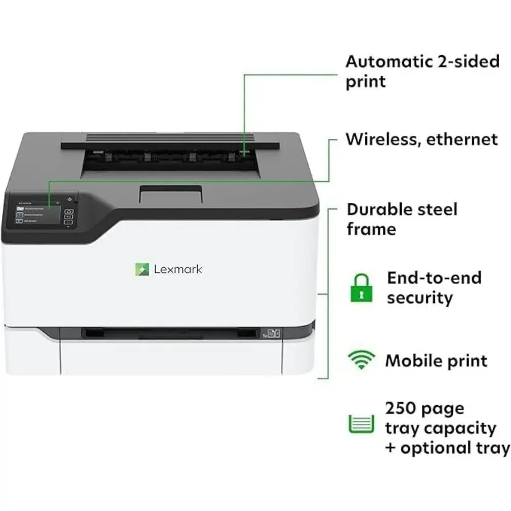 The Lexmark CS431dw is a color laser printer designed for small to medium offices, offering robust printing performance with a focus on quality and speed. It uses advanced LED print technology coupled with a powerful 800 MHz processor that ensures efficient job processing. Featuring a standard memory capacity of 512 MB, expandable up to 1.5 GB, the device handles complex documents and graphics smoothly. The CS431dw supports multiple connectivity options including Gigabit Ethernet, USB 2.0, and Wi-Fi for flexible network integration. It delivers color prints at up to 25 pages per minute with a resolution reaching 1200 x 1200 dpi for sharp and vibrant outputs. Additionally, it includes duplex printing capabilities to save paper and increase productivity.