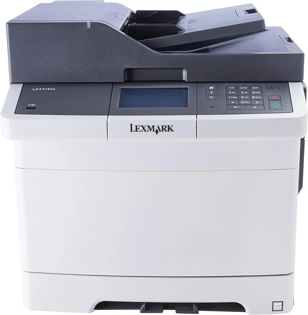 The Lexmark CX410de is a compact color laser multifunction printer designed for small to medium-sized offices. It integrates print, scan, copy, and fax capabilities into a single device, providing efficient workflow solutions. The printer utilizes laser technology to achieve sharp and vibrant color output at speeds up to 30 pages per minute for both color and black and white prints. It supports a maximum print resolution of up to 1200 x 1200 dpi, ensuring high-quality professional documents. Connectivity options include USB 2.0, Ethernet, and optional wireless networking, allowing versatile integration in office environments. Equipped with a 3.5-inch color touchscreen, the device facilitates easy navigation through various functions and workflows.