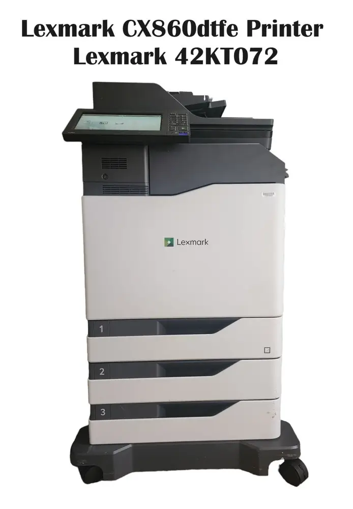 The Lexmark CX860dtfe is a robust multifunction color printer designed for high-volume office environments. It integrates print, copy, scan, fax, and document finishing capabilities into one device, supporting speeds up to 57 pages per minute in both color and black & white. The machine uses advanced LED technology and supports resolutions up to 1200 x 1200 dpi, ensuring sharp and precise output quality. Equipped with a 7-inch color touch screen, it allows intuitive user interaction and easy access to customizable workflows. The printer supports various connectivity options including Ethernet, USB, and optional Wi-Fi, enabling versatile office integration. Its paper handling includes multiple trays with capacity up to 4,500 sheets, plus staple finishing and hole punching for professional document preparation.