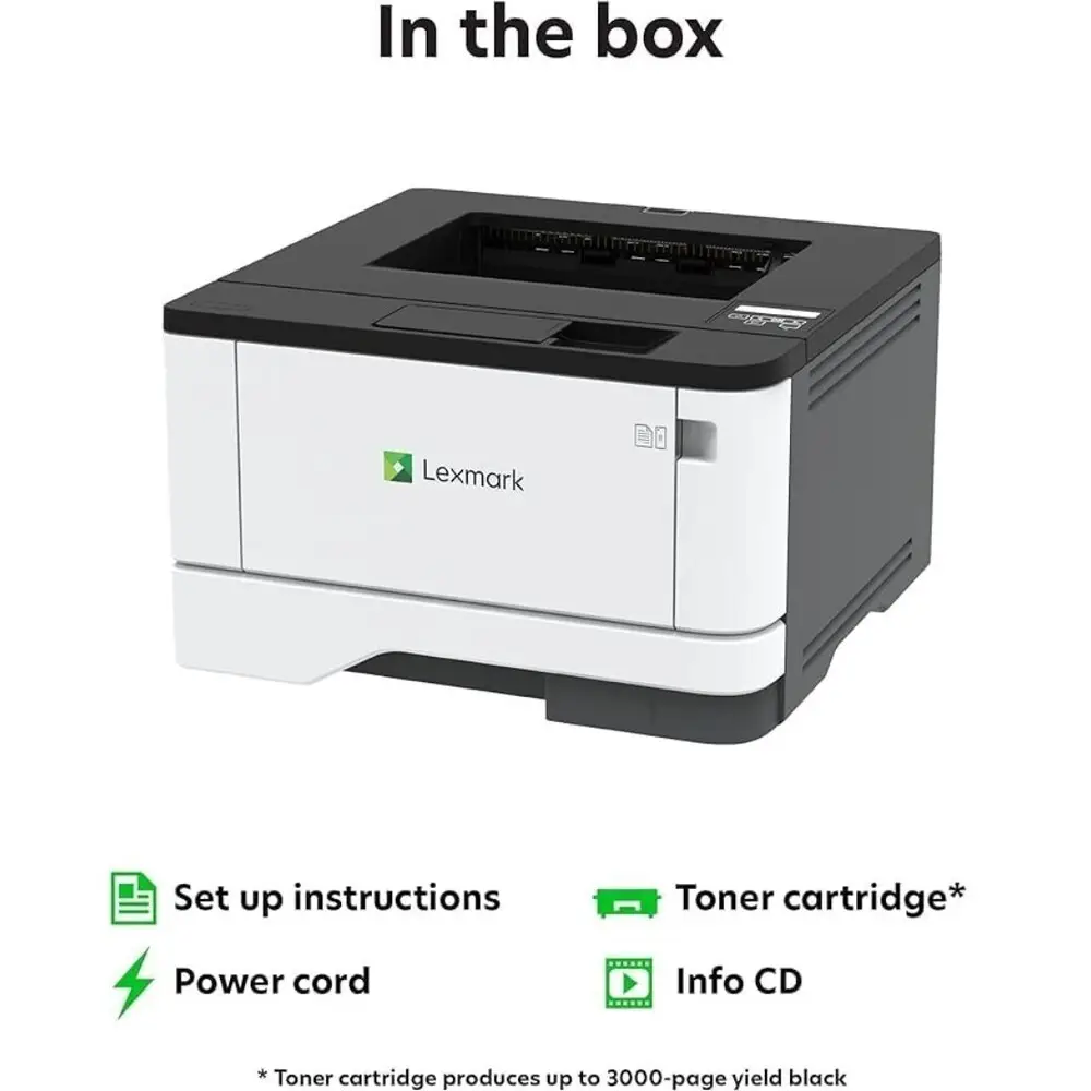 The Lexmark MS431dw offers impressive print speeds up to 40 ppm, perfect for busy offices. Its integrated wireless and Ethernet connectivity provide seamless network printing options. Automatic duplex printing reduces paper consumption and manual intervention. The device's robust 600 MHz processor and 512 MB RAM ensure smooth handling of high-volume and complex print jobs. It supports a high monthly duty cycle of up to 80,000 pages, ensuring durability and reliability. Compact design minimizes office footprint while maintaining strong paper handling versatility.