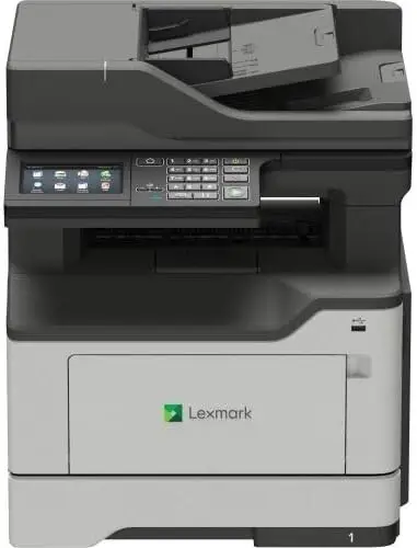 The Lexmark MX421ade is a multifunction monochrome laser printer designed for office environments seeking efficient document management. It features print, copy, scan, and fax capabilities integrated into one compact device. Powered by a 800 MHz dual-core processor and 256 MB RAM, it delivers print speeds up to 42 pages per minute. The printer supports up to 1200 x 1200 dpi effective output quality, ensuring clear and professional documents. Connectivity options include USB 2.0, Ethernet, and optional wireless networking for versatile deployment. The device supports various media sizes and types, with a standard 250-sheet input tray expandable to 850 sheets for higher volume tasks.