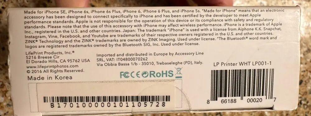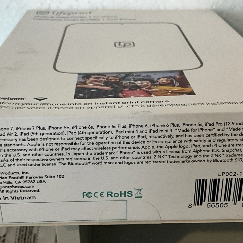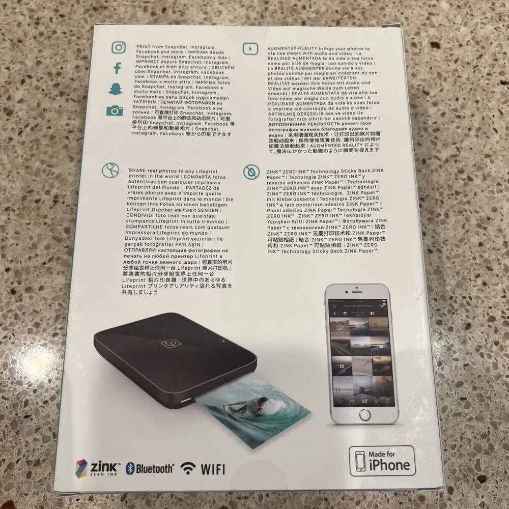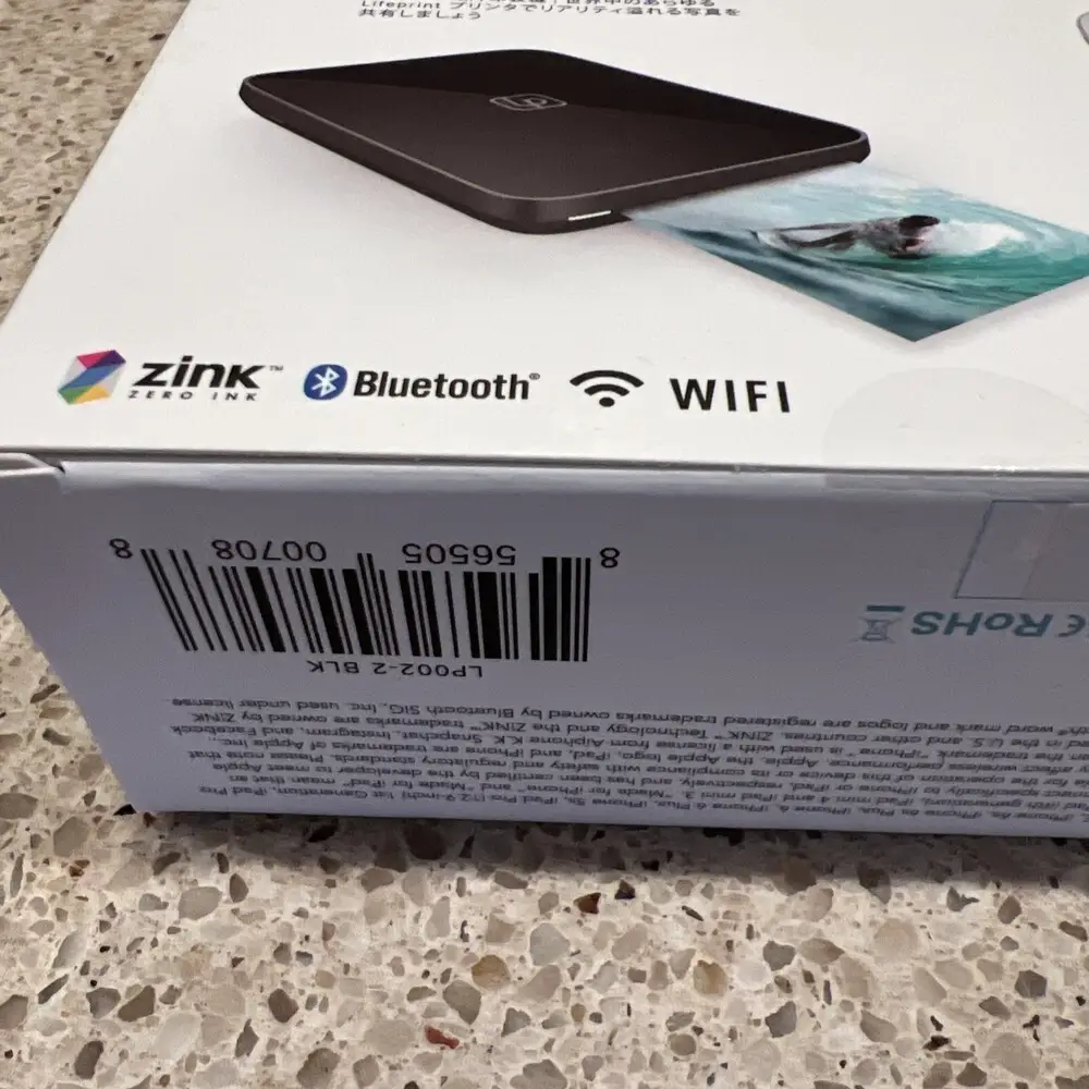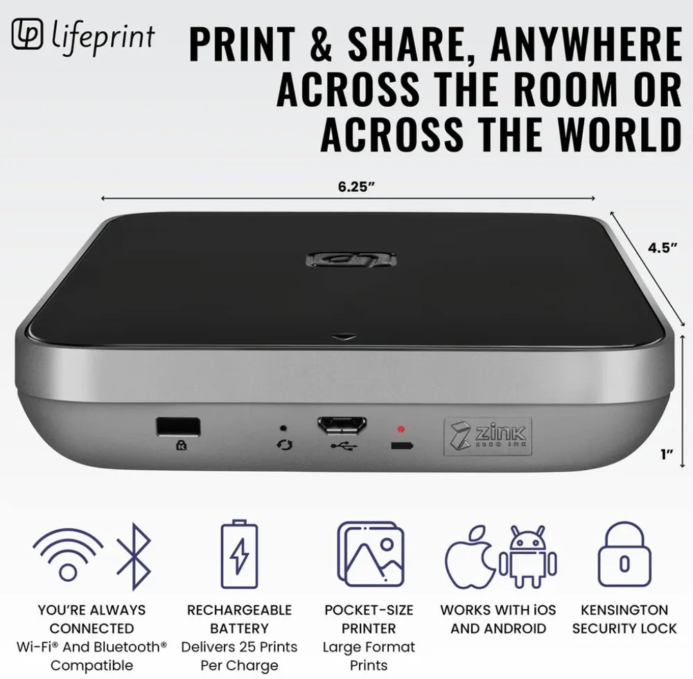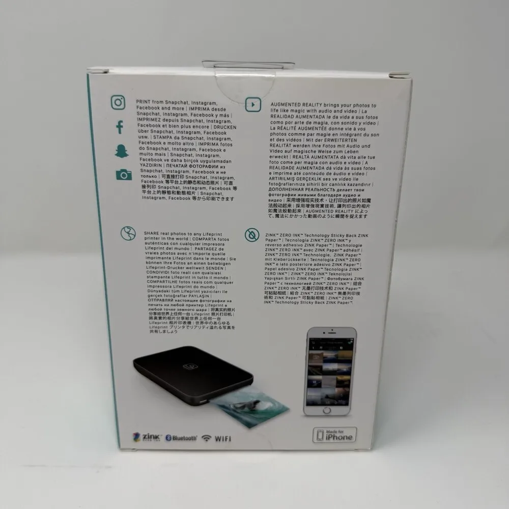 The Lifeprint LP3X4PVPBKAPL is a compact portable photo printer designed to deliver instant mobile printing using smartphone connectivity. It utilizes zero-ink ZINK printing technology, producing smudge-proof, water-resistant, and tear-resistant prints. This device incorporates Bluetooth 4.0 for seamless wireless transmission from compatible iOS and Android devices. The printer supports the Lifeprint app, which enables augmented reality photo enhancement and social media integration. Its built-in rechargeable lithium-ion battery offers portability with several prints per charge. The overall construction emphasizes lightweight design, enhancing mobility without compromising print quality.