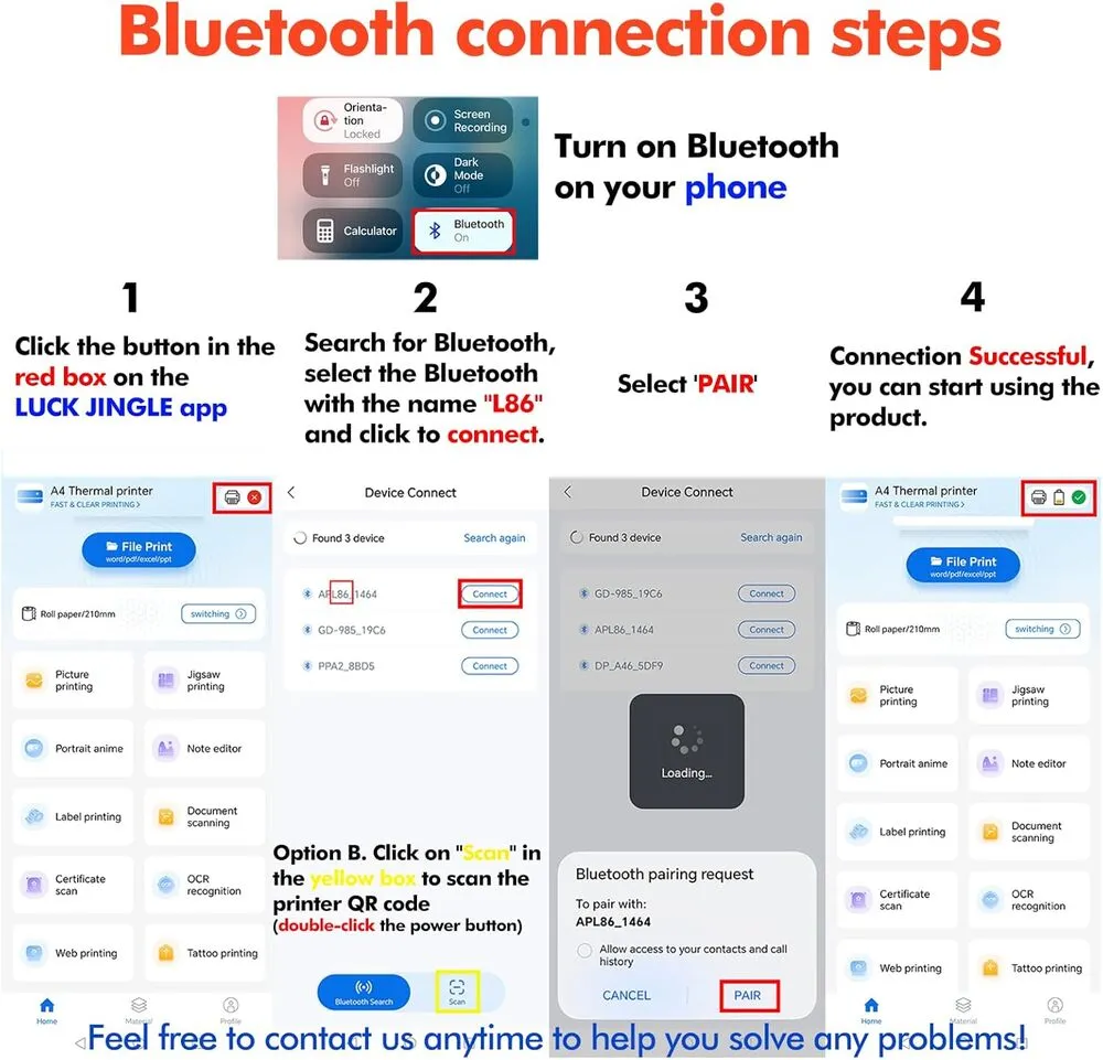 The printer supports Bluetooth and USB connections to interface with various devices.
