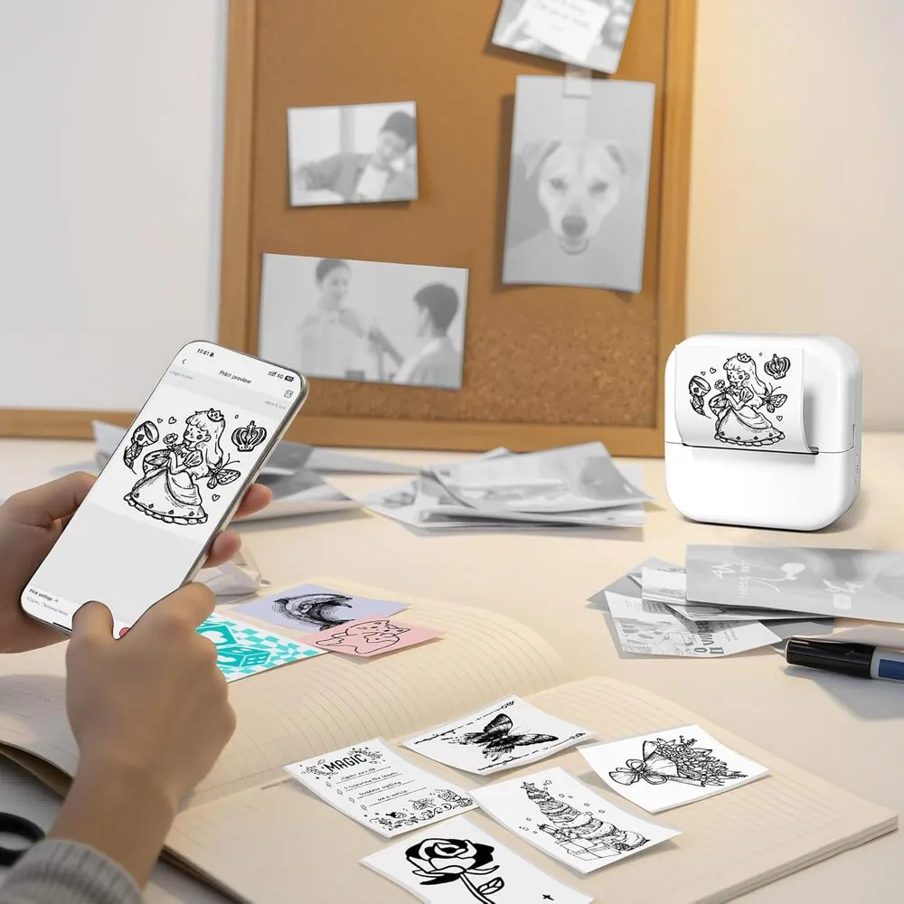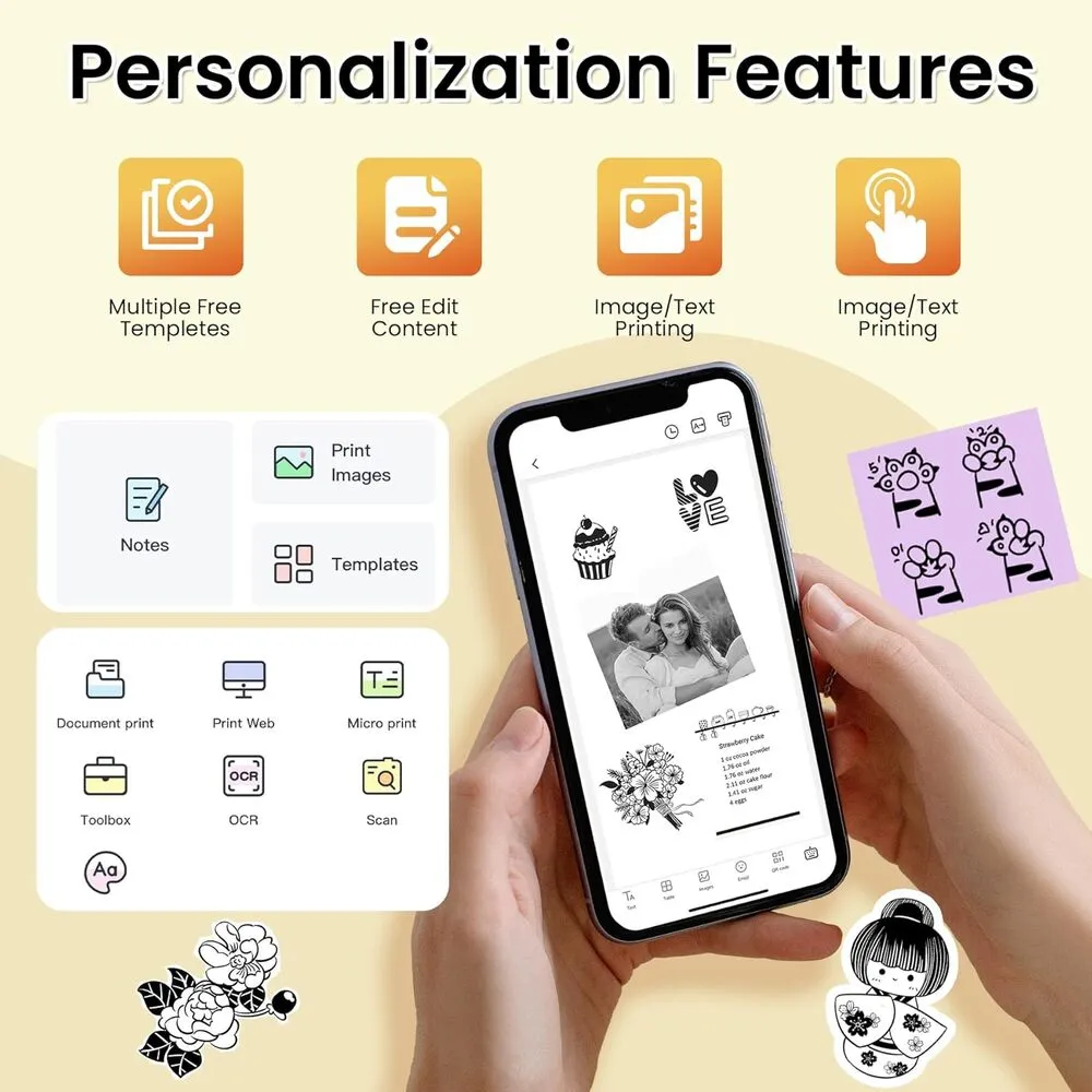 The printer supports multiple label sizes and types, providing flexibility for different sticker and labeling requirements. It integrates with intuitive mobile applications that allow easy customization and printing of barcodes, QR codes, and text labels.