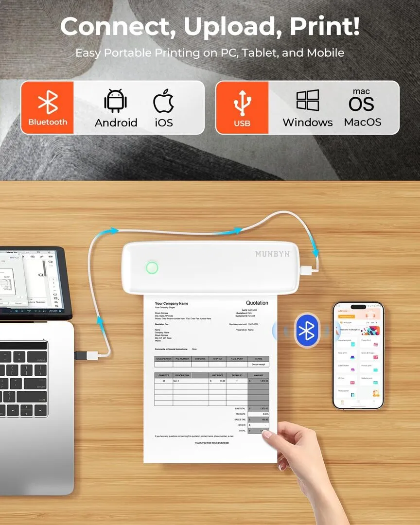 Included Components | 1 A-C Adapter, 1 MUNBYN ITP04 Portable Printer White, 1 USB-Type C Cable, 1 User Manual, Paper |