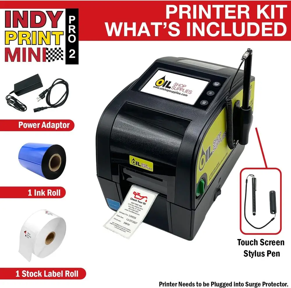 Included Components | Indy Print Mini Pro Printer, Stylus, Power Adapter (2-pieces), Ink Take-Up Core (pre-installed), Ink Ribbon (pre-installed), one label roll, quick-start manual, limited 2-year printer warranty |