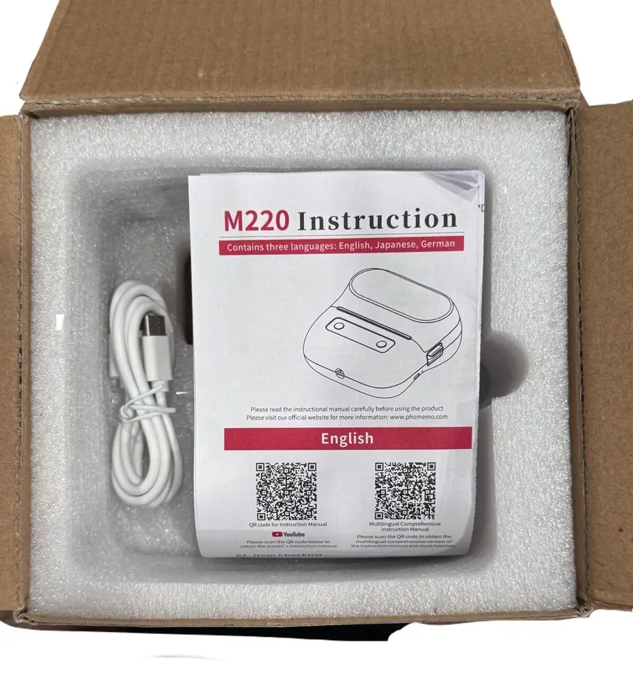 The Phomemo M220 Pocket Printer is a compact thermal label printer designed for convenience and portability. It utilizes thermal printing technology, eliminating the need for ink cartridges or ribbons. The device supports a maximum print resolution of 203 dpi, delivering clear and sharp monochrome labels. Connectivity is established via Bluetooth 4.0, allowing seamless integration with smartphones and tablets using the dedicated Phomemo app. Power is supplied by a built-in rechargeable lithium-ion battery which provides extended usage periods between charges. The printer supports various label widths up to 56mm, catering to a variety of labeling needs.