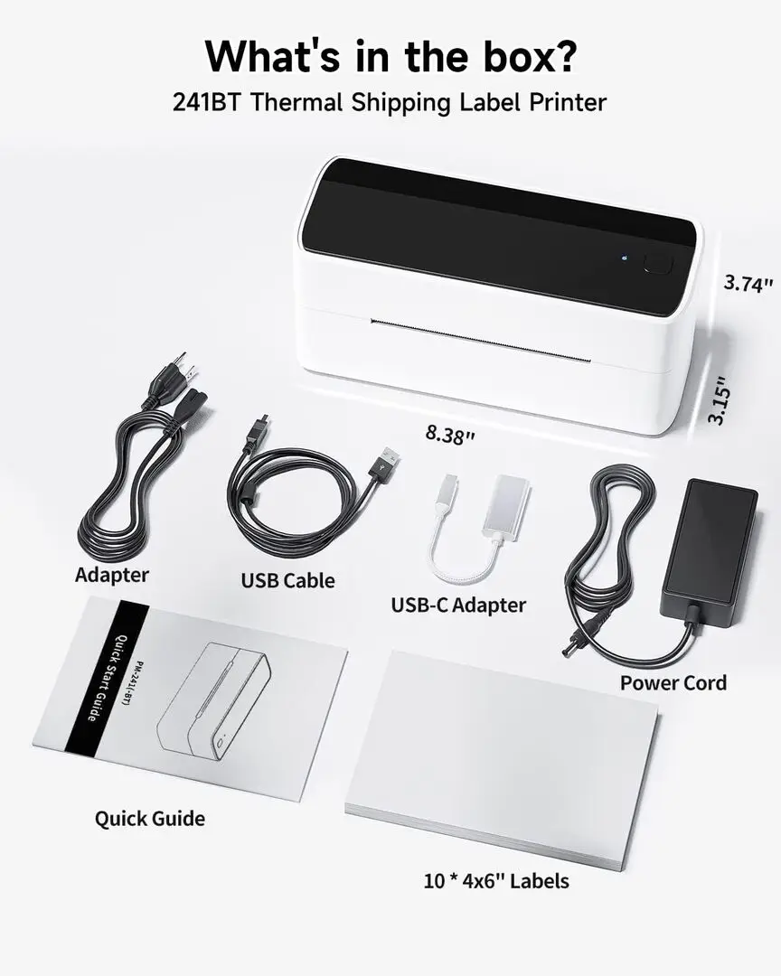 Included Components | 1 X 241BT Label Printer User Manual, 1 X Phomemo 241BT Bluetooth Thermal Shipping Label printer, 1 X Power Cord & Adapter for Shipping Label Printer, 1 X USB cord / 1 X Type C Convertor for MAC, 10 X Sheets of 4X6" Shipping Labels for Test |
