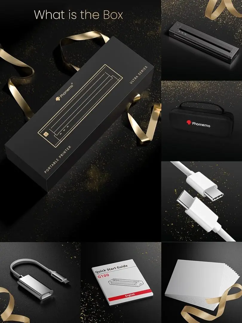 Included Components | Double-ended Type-C cablex1; Type-C to USB adapter x 1, Phomemo G100 Quick Start Guide, Phomemo G100 Ultra Portable Printer, Single-sided Thermal Paper-20 sheetsx1, Storage bag |