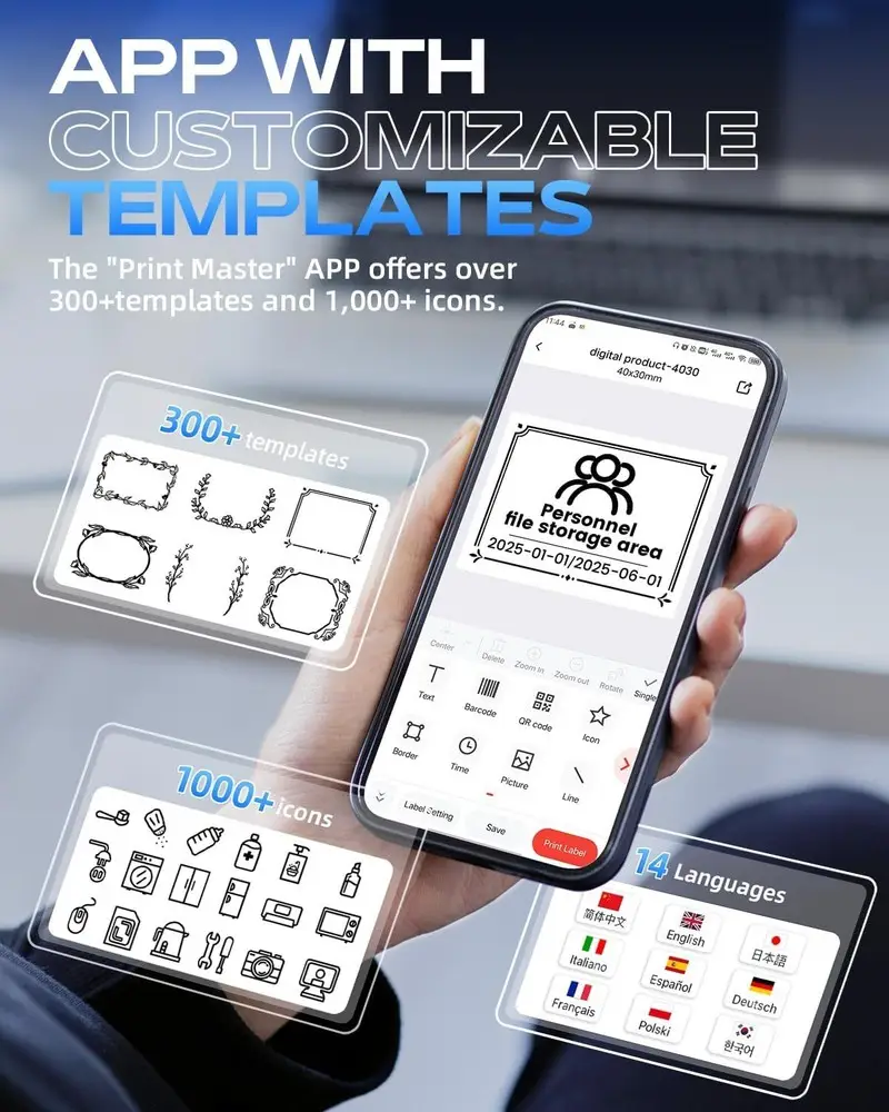 Its thermal thermal printing technology ensures quiet operation and low maintenance requirements. The device comes with an easy-to-use companion app compatible with iOS and Android systems to create customized labels with various fonts, symbols, and templates. The printer's compact design and lightweight build make it suitable for various office environments as well as personal organizational uses.