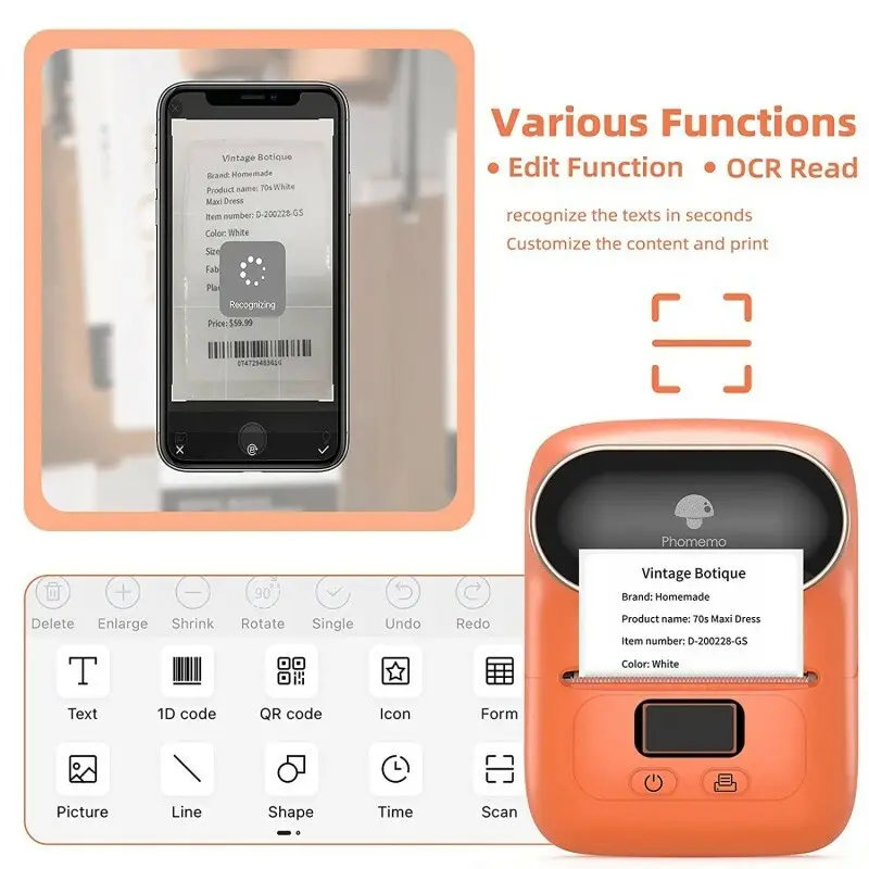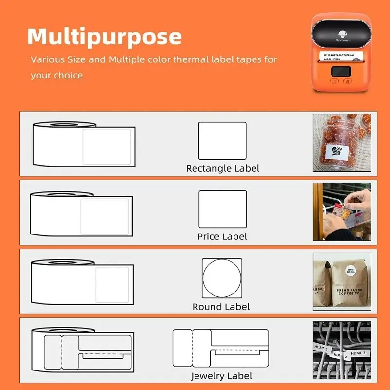 The Phomemo M110-OG is a compact thermal label printer optimized for on-demand labeling tasks in office and retail environments. It employs direct thermal printing technology, eliminating the need for ink or toner cartridges. The device supports label widths up to 58mm and achieves printing speeds of up to 90mm per second, balancing quality and efficiency. Connectivity includes Bluetooth 4.0 for seamless wireless printing from mobile devices and USB for wired connections. The printer is lightweight and portable, enabling ease of use in various workspaces. Firmware supports multiple label formats with customizable templates through Phomemo's dedicated application software.