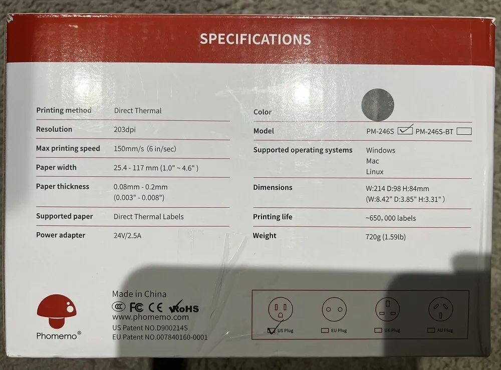 Included Components | 1 * 246S Black Bluetooth Shipping Label printer, 1 * PM-246S label printer quick start guide, 1 * Power Cord&Adapter for thermal printer, 1 * USB-C adapter for MAC OS thermal printers, 20 * 4x6 shipping labels for print test |