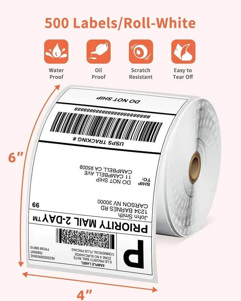 The printer supports label sizes up to 4x6 inches, making it ideal for shipping and inventory labels.