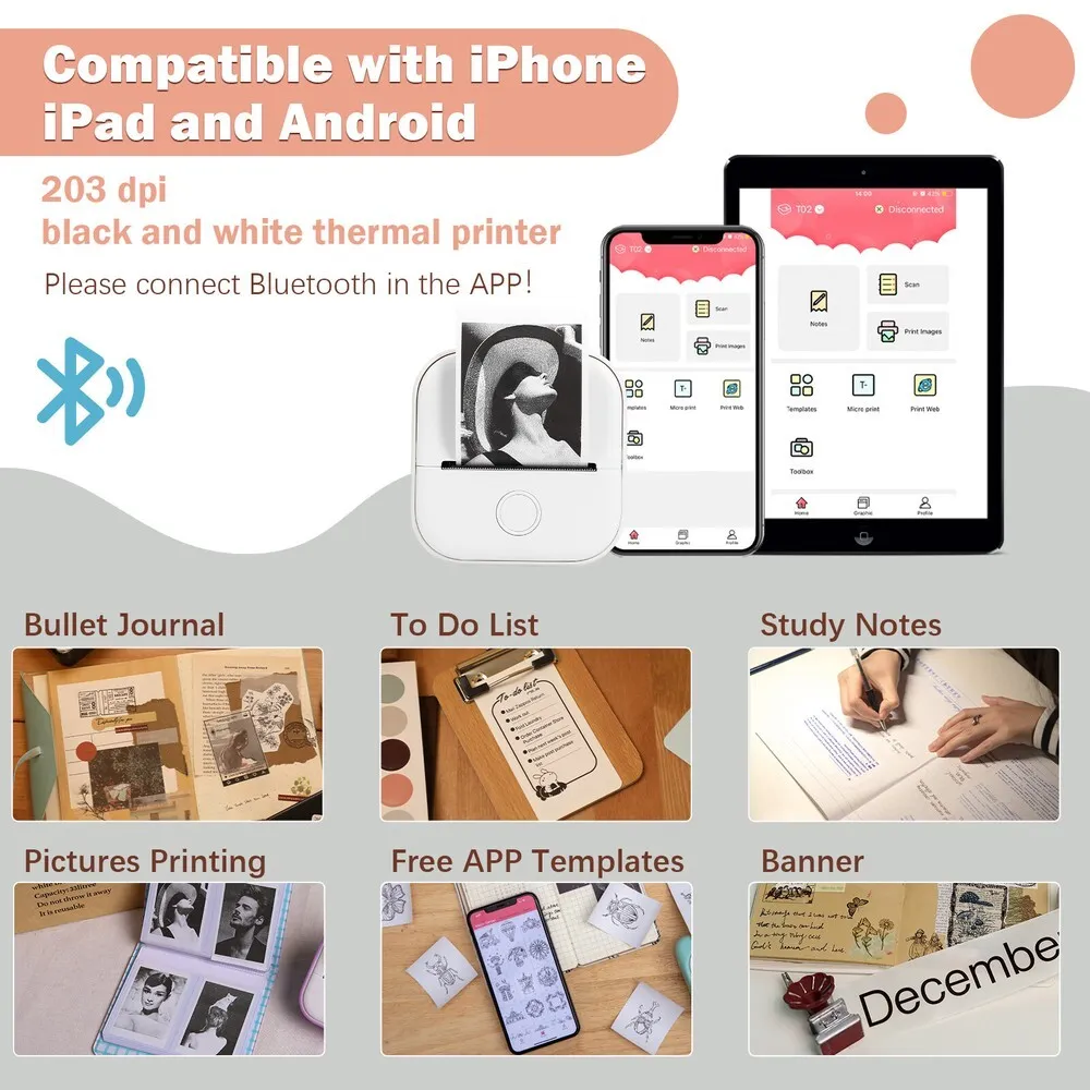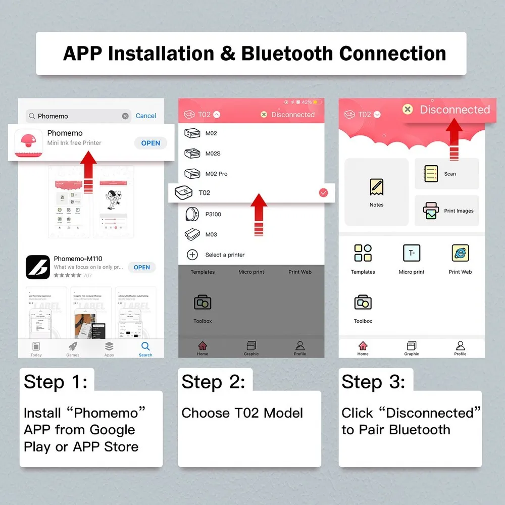 The T02 connects via Bluetooth 4.0 to smartphones, tablets, and PCs using dedicated Phomemo apps.