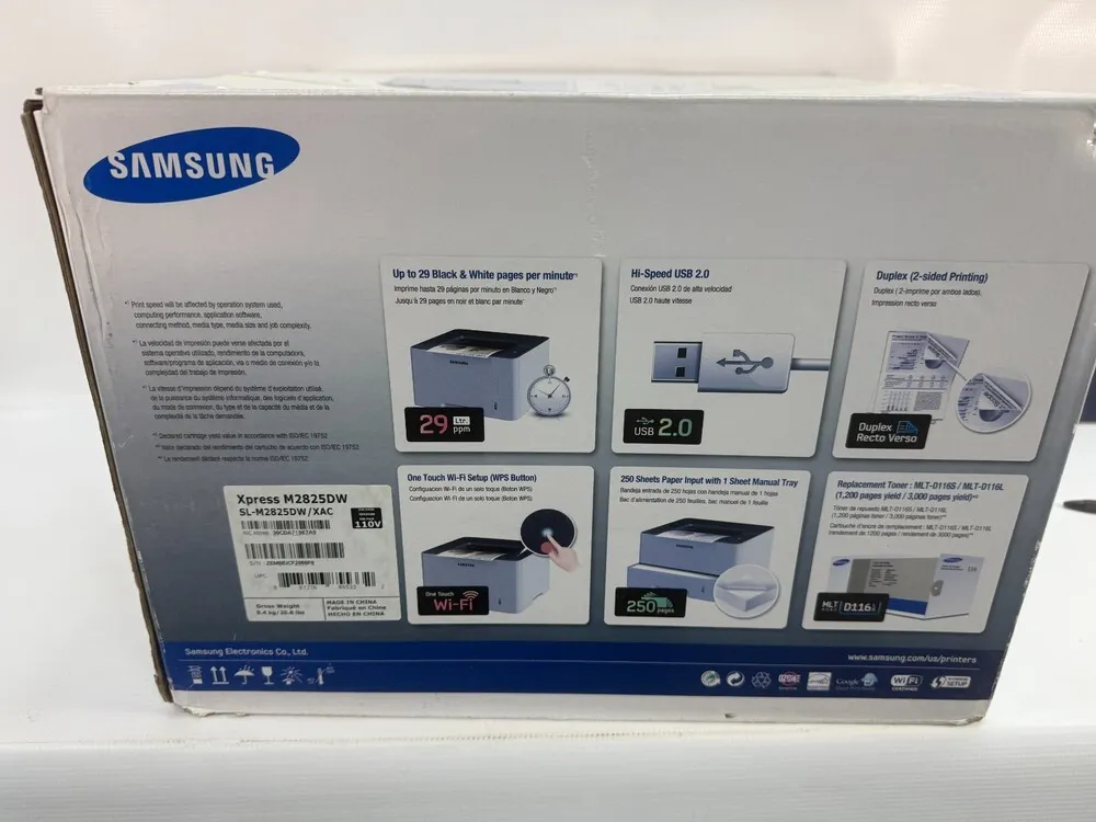 The Samsung Xpress M2825DW is a monochrome laser printer designed primarily for office environments requiring reliable and fast printing. It utilizes a laser print engine capable of producing sharp text with a resolution of up to 1200 x 1200 dpi. The device supports both USB 2.0 and wireless 802.11 b/g/n connectivity, allowing flexible deployment in various office setups. Its processor runs at 600 MHz, coupled with 128MB of RAM for efficient print job handling. The printer's first page out time is approximately 8.5 seconds, and it achieves print speeds up to 29 pages per minute, balancing speed and quality. Additionally, the device supports mobile printing options, including Samsung Mobile Print, Google Cloud Print, and Apple AirPrint, enhancing usability in modern workflows.
