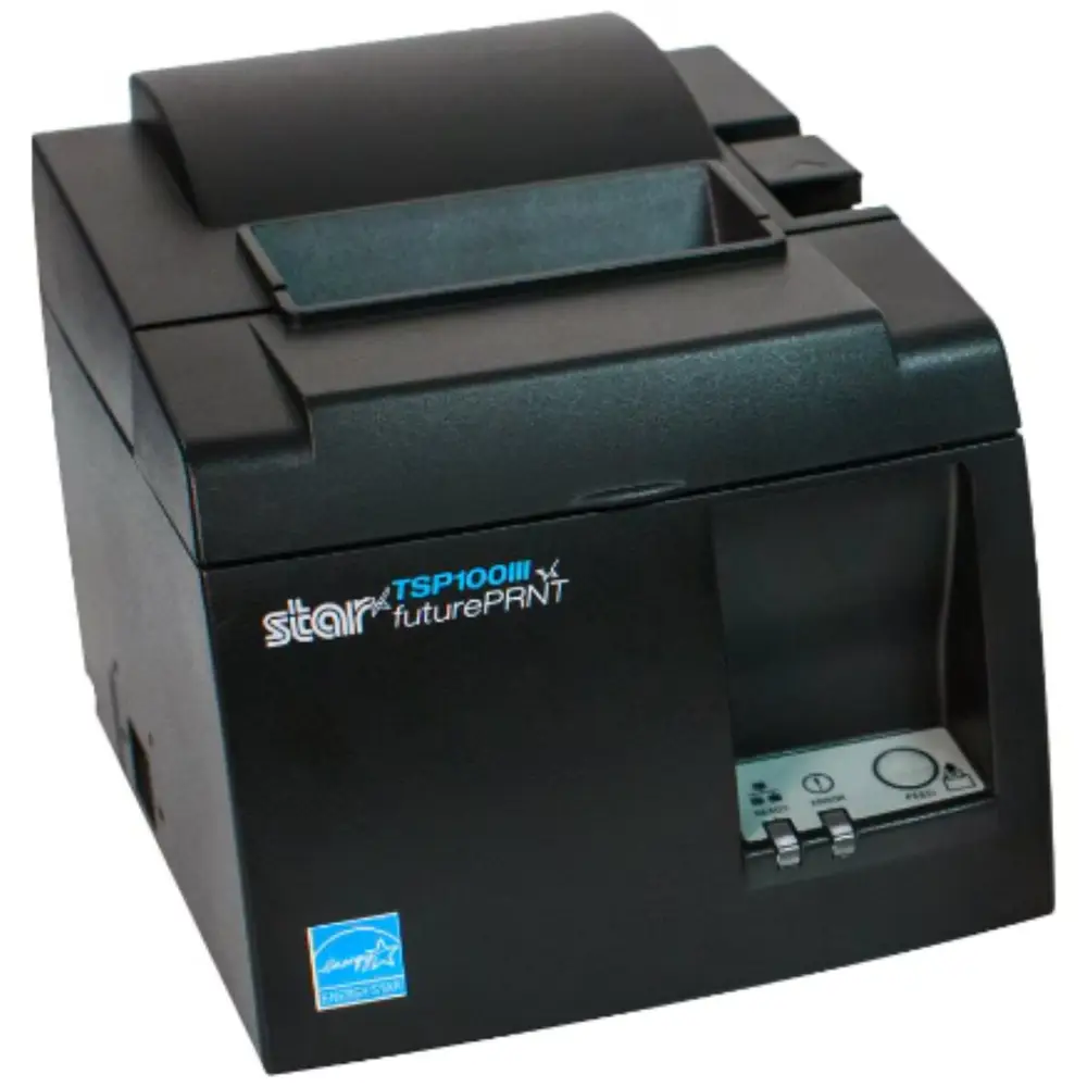 The Star Micronics TSP143IIIU is a high-speed thermal receipt printer designed for efficient point-of-sale environments. It features a USB 2.0 interface that ensures fast and reliable data transfer. The printer supports a print speed of up to 250mm per second, enhancing transaction efficiency. Equipped with a 203 dpi resolution thermal print head, the TSP143IIIU delivers sharp and clear receipts. It accommodates paper widths of 80mm, making it compatible with standard POS receipt rolls. The device supports multiple command sets including StarPRNT and ESC/POS, facilitating wide compatibility with existing POS software systems.