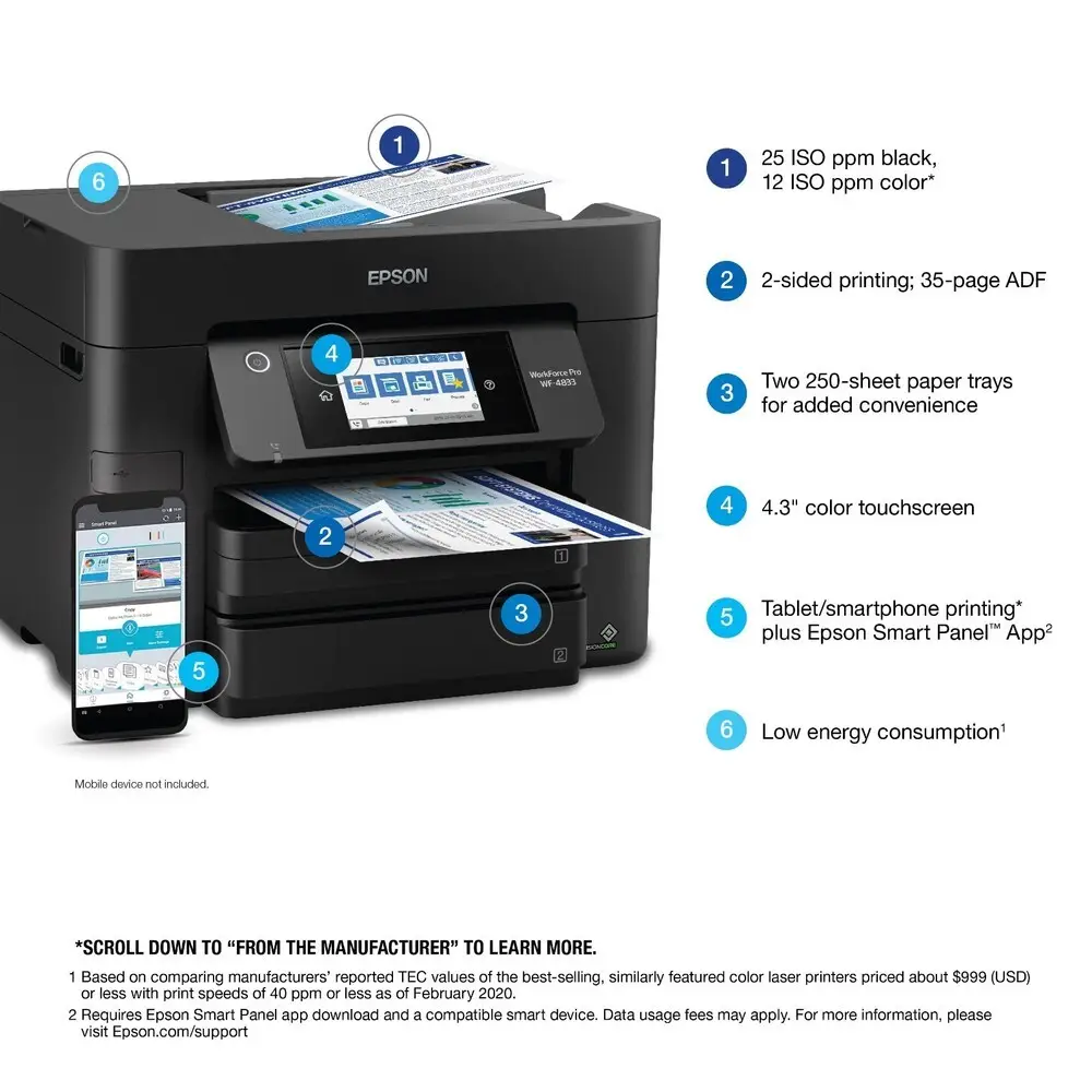 The Epson Workforce PRO WF-4833 is an advanced all-in-one inkjet printer designed for mid-sized office environments, offering high-speed printing, scanning, copying, and faxing functions. It features PrecisionCore technology with a Micro Piezo inkjet print head for sharp text and vibrant color output, supporting print resolutions up to 4800 x 1200 dpi. The device incorporates a 500-sheet input capacity with dual paper trays and supports automatic duplex printing to reduce paper usage. Connectivity options include USB 2.0, Ethernet, and Wi-Fi, enabling flexible network integration and mobile printing through Epson Connect services. The embedded 4.3-inch color touchscreen LCD provides user-friendly operation, and the device supports PCL and PostScript emulation for versatile compatibility. With a monthly duty cycle of up to 45,000 pages, the WF-4833 is optimized for robust office productivity.