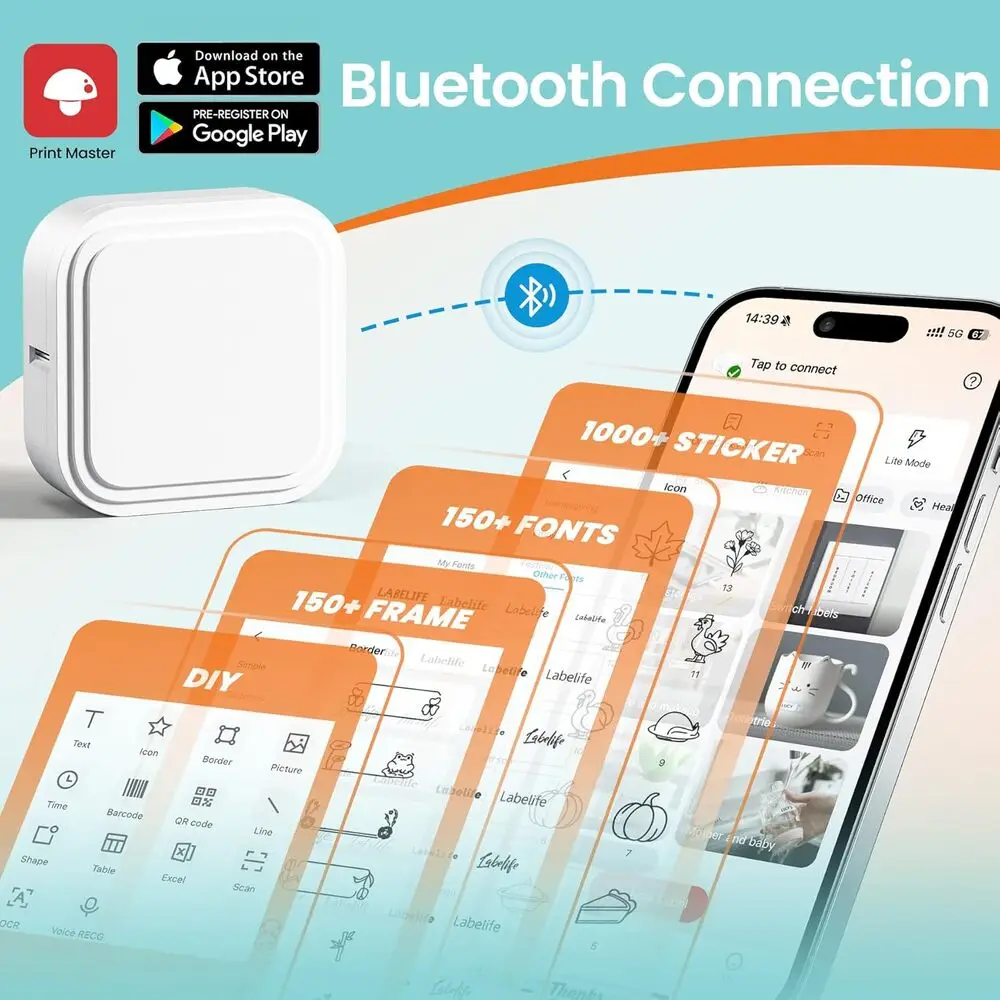 The Bluetooth connectivity enables convenient wireless operation and device pairing without cables. Thermal printing technology reduces maintenance and the cost of ink supplies. Multiple label size compatibility enhances versatility for different labeling applications. The device is lightweight and portable, facilitating labelling in various locations. Rechargeable battery option allows cordless usage, increasing mobility. The dedicated app offers extensive customization options for text, fonts, symbols, and templates.