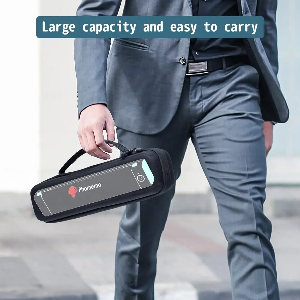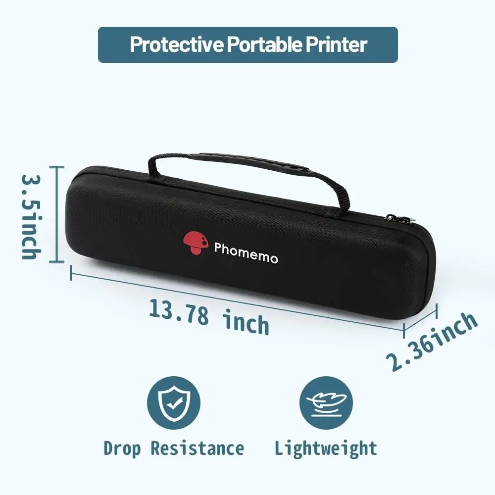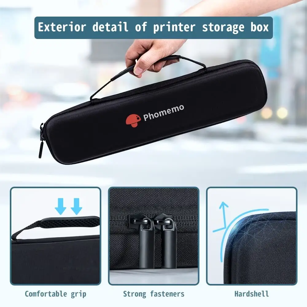 The Phomemo M08F Case, model number P-Gzj-M08Fbag-Bk, is an accessory specifically designed for the Phomemo M08F portable printer. The case features a compact, lightweight design, aimed to protect the device from dust, scratches, and minor impacts while maintaining portability. Constructed with durable synthetic leather material, it provides resistance to daily wear and maintains aesthetic appeal. The case's precise cutouts ensure full access to the printer’s buttons, ports, and labels without removal. It also offers organizational compartments for essential accessories like cables and labels. This accessory enhances the operational lifespan of the printer by mitigating external damage and offering convenient transport.