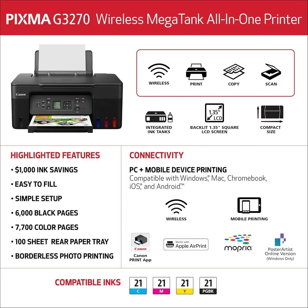 The PIXMA G3270 boasts extremely low cost per page due to its efficient refillable ink tank design. The combined functions of printing, scanning, and copying increase its utility while saving space. Its wireless connectivity feature permits flexible placement without needing direct cabling. High-quality photo printing capabilities make it suitable for creative as well as document output. The automatic power on/off helps in reducing power consumption when not in use. Easy-to-refill ink tanks reduce user maintenance efforts and minimize printer downtime.