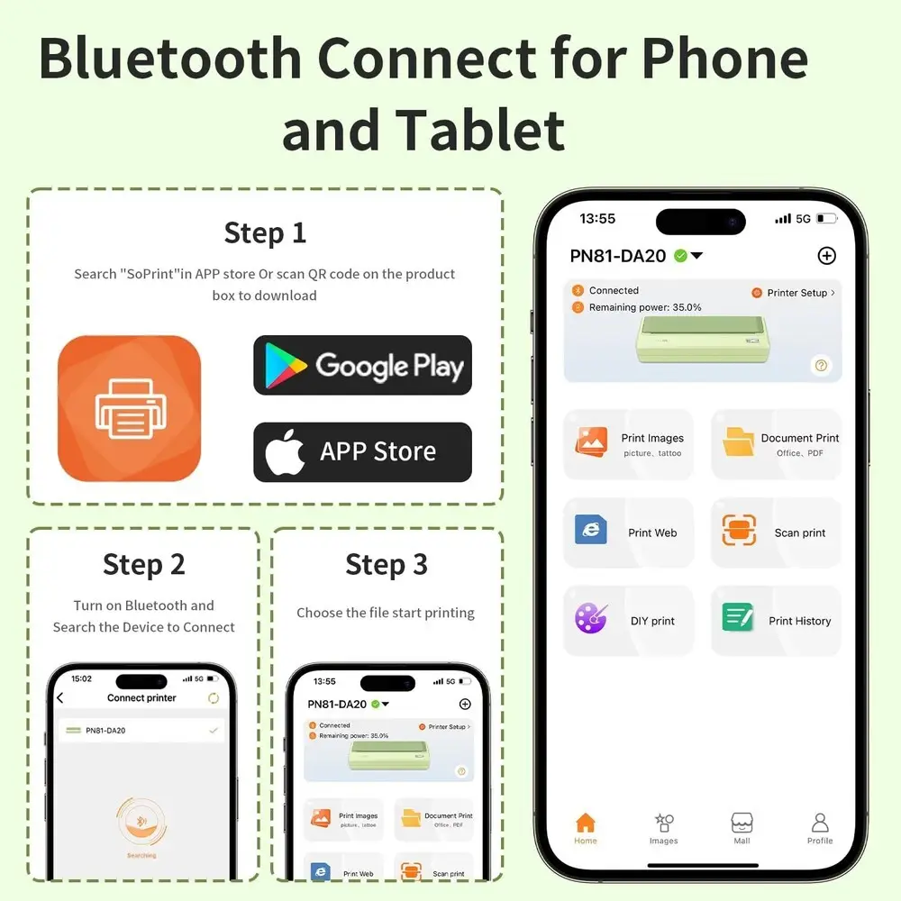The portable design enables easy transport and use in various environments. Bluetooth connectivity provides wireless convenience for mobile devices. Thermal printing technology offers low maintenance cost and high printing speed. The rechargeable battery supports continuous use without power outlet reliance. Its compatibility with A4 paper size makes it versatile for multiple office document formats. The compact form factor allows it to fit into small office spaces or travel bags.