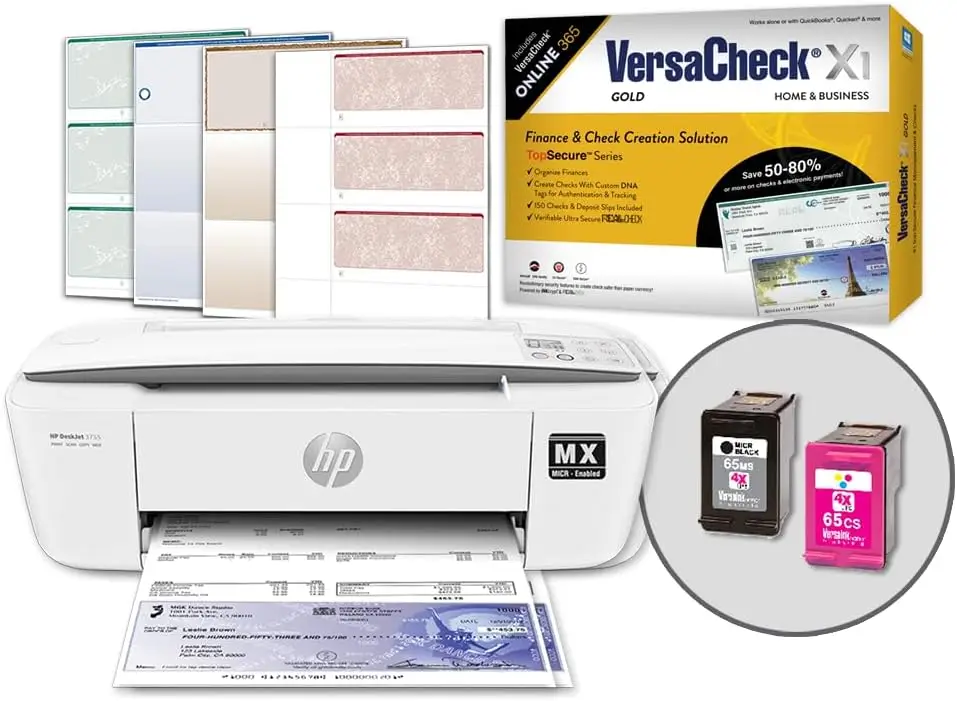 The VersaCheck 4155 MX is a versatile DeskJet Plus series all-in-one printer designed for efficient office use. It supports laser-quality monochrome print speeds of up to 25 pages per minute and color printing at moderate speeds, ensuring balanced performance for document handling. The device integrates a flatbed scanner and automatic document feeder (ADF) for multi-page scanning and copying tasks, enhancing productivity. Connectivity options include USB 2.0 and wireless support, facilitating versatile network integration. The printer supports standard paper sizes with a maximum input capacity of 150 sheets, suitable for small to medium-sized workgroups. Its built-in control panel with an LCD screen simplifies operation and status monitoring.
