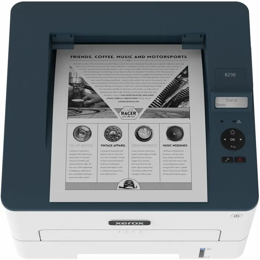 The Xerox B230 is a monochrome laser printer designed primarily for office use.