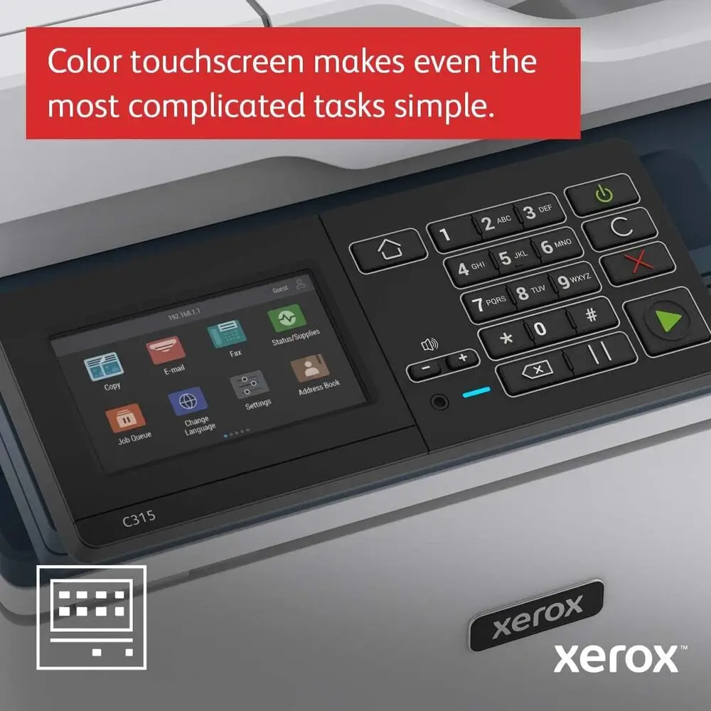 The Xerox C315/DNI has a relatively modest paper tray capacity, which may require frequent refilling in high-volume environments. Its fax capabilities are basic compared to dedicated fax machines. The device may have slower first-page-out times when compared to some competitive models. High-resolution color print costs can be higher due to toner consumption. Some users might find the touchscreen interface less intuitive compared to other models with advanced user interfaces. Firmware updates may occasionally be required to fix connectivity or functional bugs.