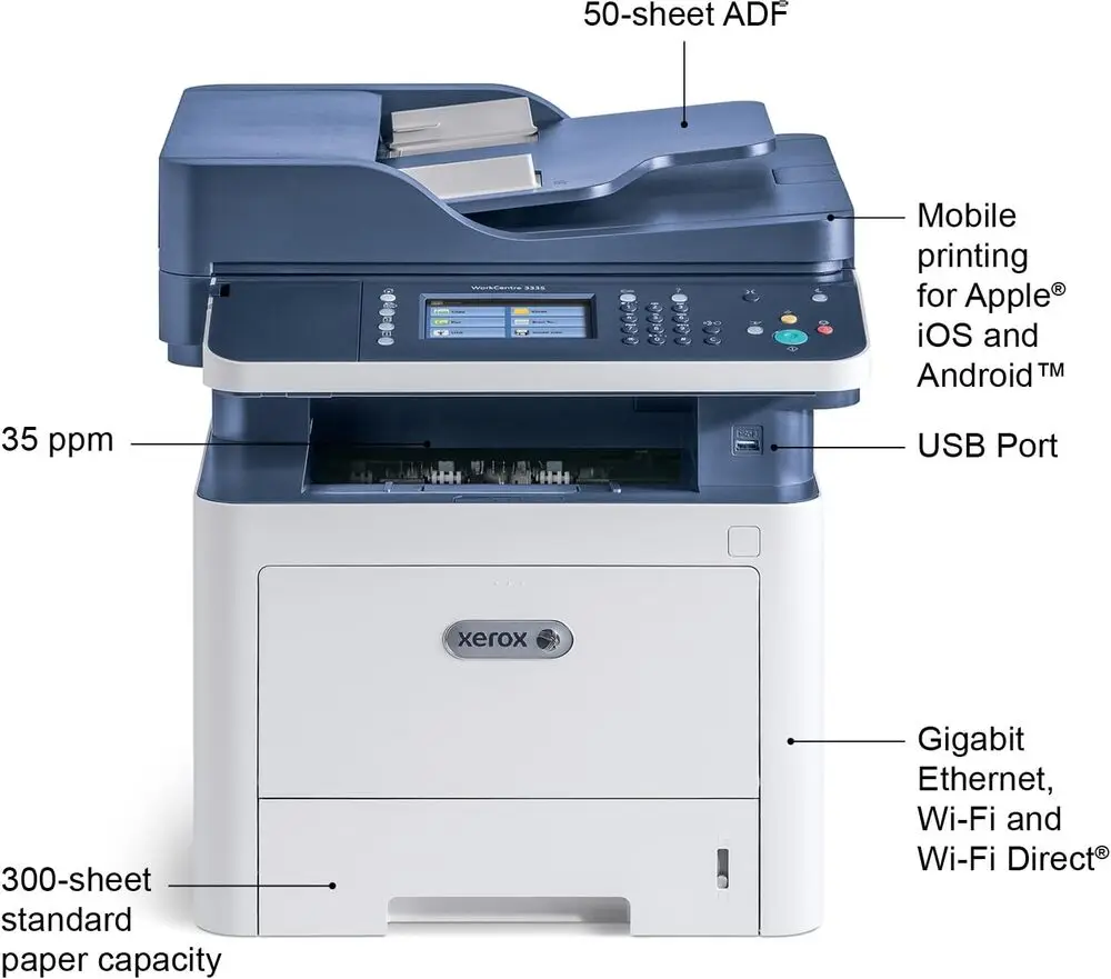 The Xerox 3335/DNI is a monochrome laser printer designed primarily for office environments. It features a printing resolution of up to 1200 x 1200 dpi, enabling crisp, professional-quality documents. The device supports a print speed of approximately 35 pages per minute, optimized for high-volume printing tasks. It is equipped with a standard memory capacity expandable up to 320 MB to efficiently process complex print jobs. Connectivity options include USB and network interfaces, facilitating flexible integration into various office setups. This model employs a toner cartridge system engineered for reliable output and manageable maintenance.