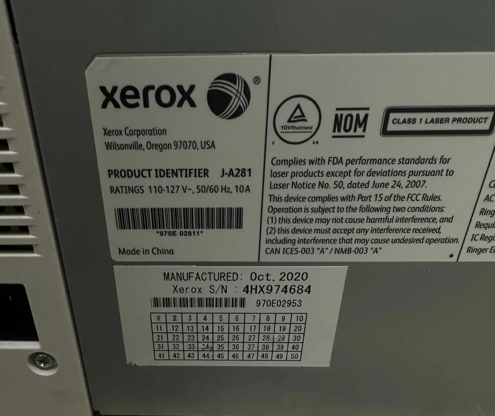The device also supports mobile printing protocols, including Apple AirPrint, Google Cloud Print, and Xerox's own Print Service, enabling flexible printing from various devices. Paper handling includes a standard 550-sheet input capacity, expandable to 2,300 sheets with optional trays. Duplex (two-sided) printing is built-in, promoting efficient paper use. Security features include secure print, encrypted disk storage, and user authentication to safeguard sensitive documents.