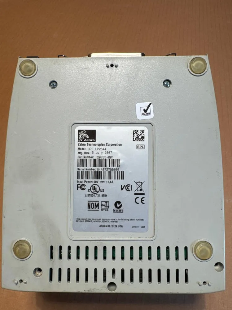 The Zebra LP2844 is a thermal transfer and direct thermal desktop label printer designed for office and industrial uses. It operates with a maximum print width of 4.09 inches and a resolution of 203 dpi, delivering clear, precise label prints. The printer supports various label materials and widths (up to 4.25 inches), and features a print speed of up to 4 inches per second. Connectivity options include serial, parallel, and USB interfaces, enabling versatile integration into different POS or labeling systems. It has an internal ribbon compartment for thermal transfer printing and supports various programming languages such as EPL and ZPL for flexible label design and control. The device is compact and designed for reliable, high-volume label printing in warehouse and retail environments.